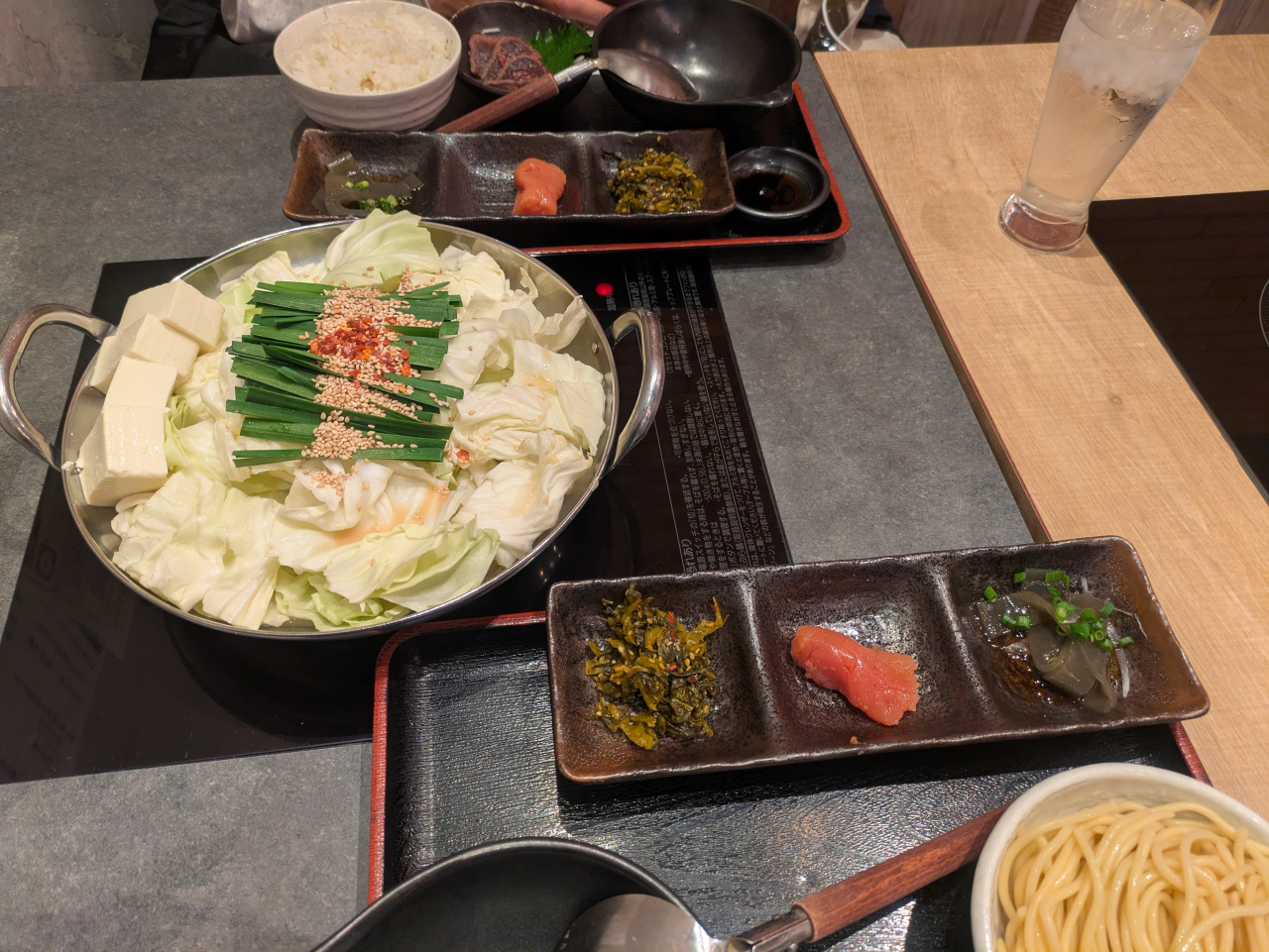 ひとり客がちらほら居たのが印象的でした。カウンター席もあるし、定食スタイルなので入りやすいのかな。かくいう自分も大勢で鍋を囲むのは苦手なので、ここなら入りやすいと思いました。「もつ鍋」は味噌としょうゆの2種類。私たちはどちらも味噌味を選んだので、同じ味付けだと1つの鍋にまとめて提供されるようです。希望すれば別々でもOKかもしれません。
