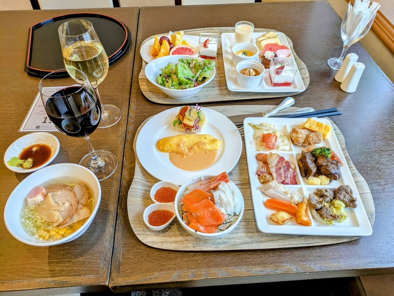 スパークリングワインと赤白ワインも飲み放題です。一番のおすすめはライブキッチンでのオムレツで、雲丹ソースが絶品です。