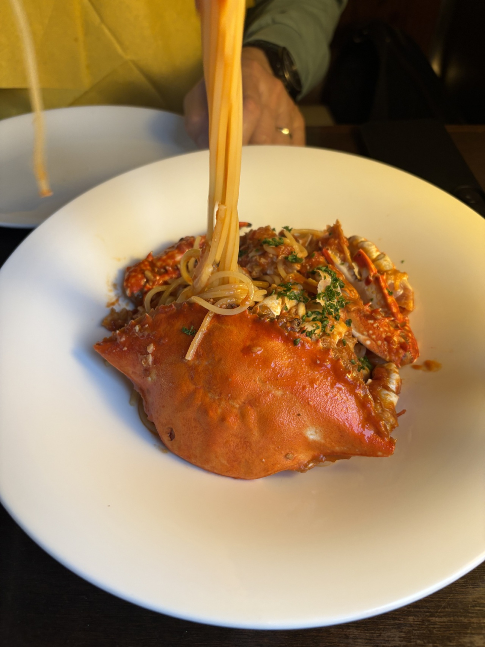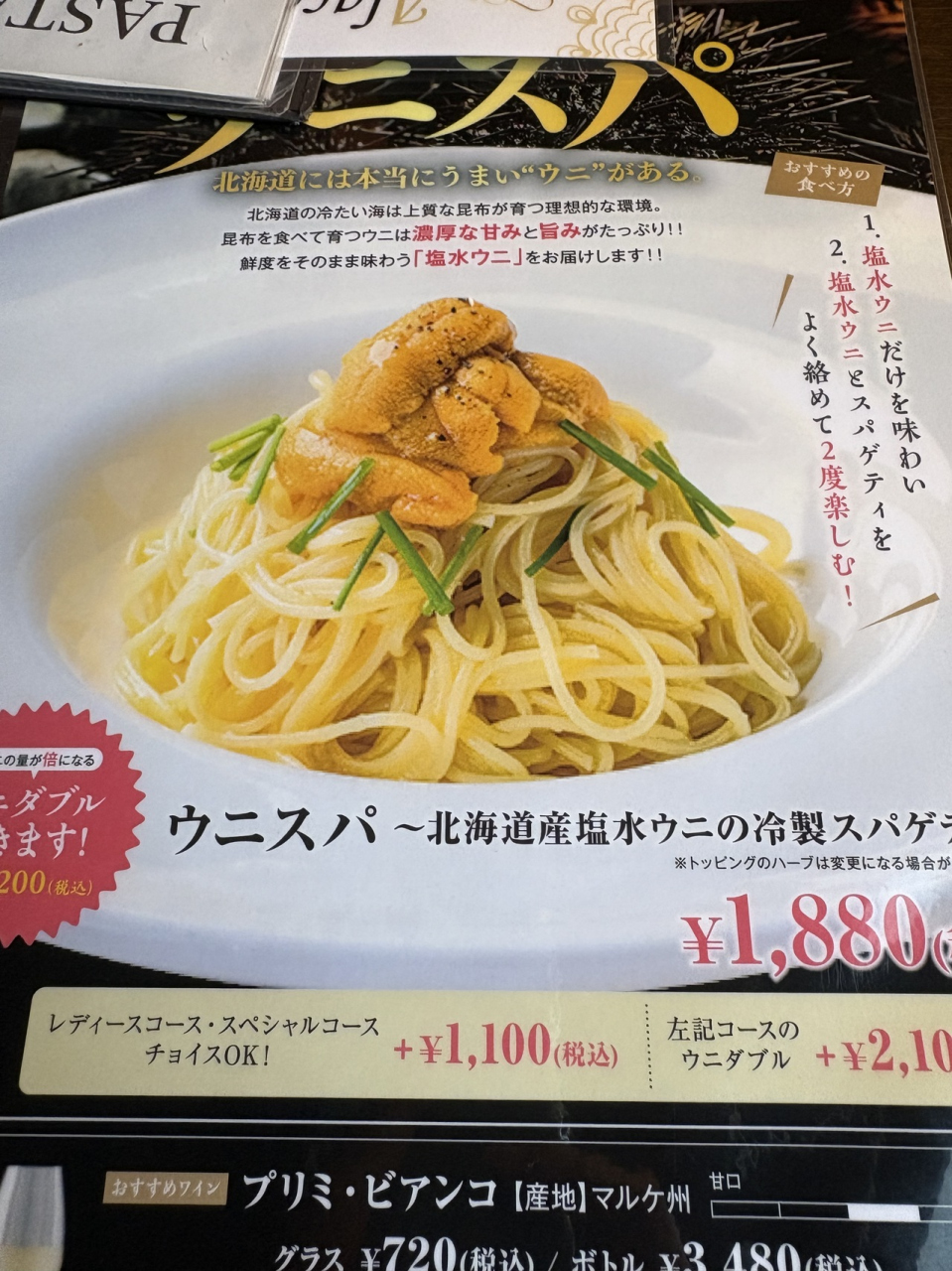 おすすめのシーザーサラダ、渡り蟹のトマトパスタ、アヒージョ、夏限定ウニパスタ