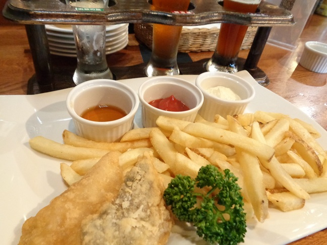 ひとりだったのでカウンターでクラフトビール3種飲み比べとフィッシュ&チップスをオーダー。グラス120mlだったのでちょっと少なく、4種セットにしたらよかったかなとちょっと後悔。フィッシュ&チップスは量が多すぎでした。