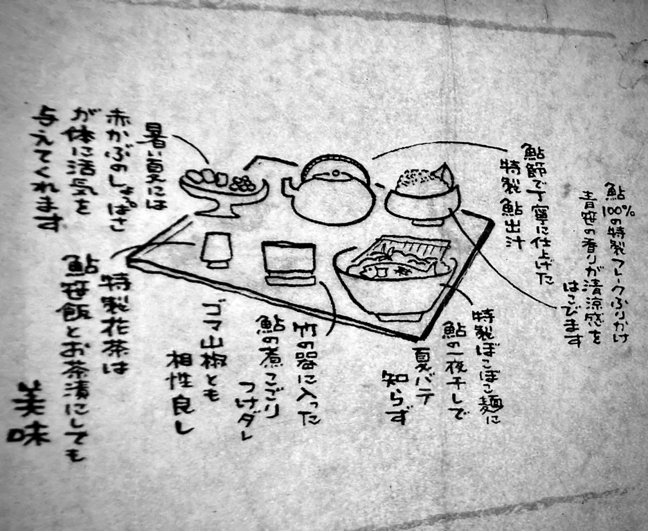 「…スープ 鮎、鶏ガラ、香味野菜。厳選された素材をじっくり7時間以上かけて、贅沢な鮎出汁のスープはつくられます…」と言うこと。