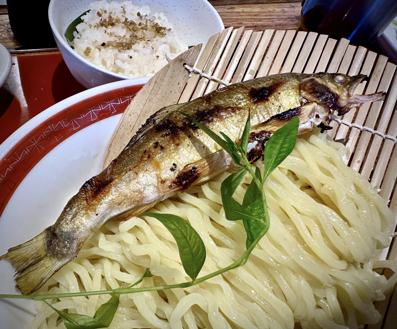 普通のラーメン(勿論、ツルツル、モチモチで本当に美味しい麺+スープも薄味で最高に美味しい…スープは、鮎出汁らしい)なのだが、鮎がドカンと丸ごと置いてあるだけでも凄い高級感…