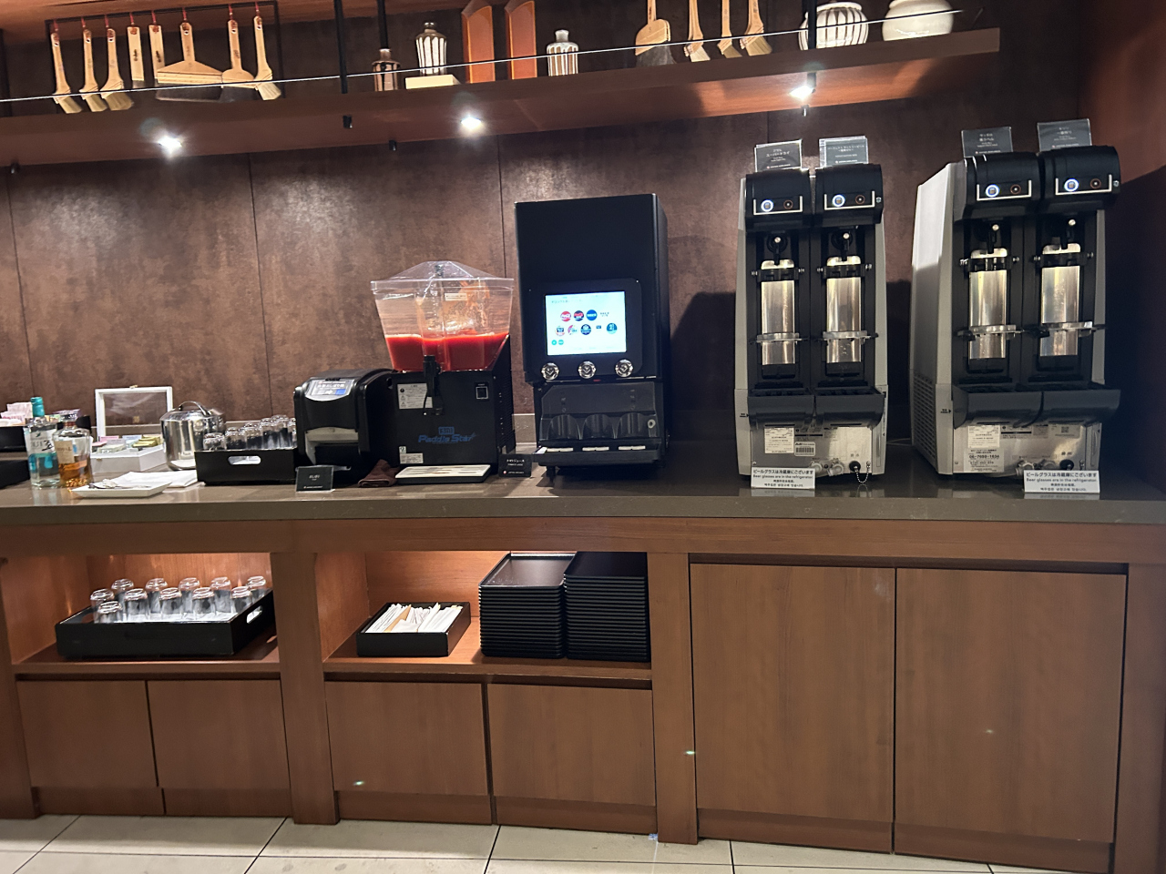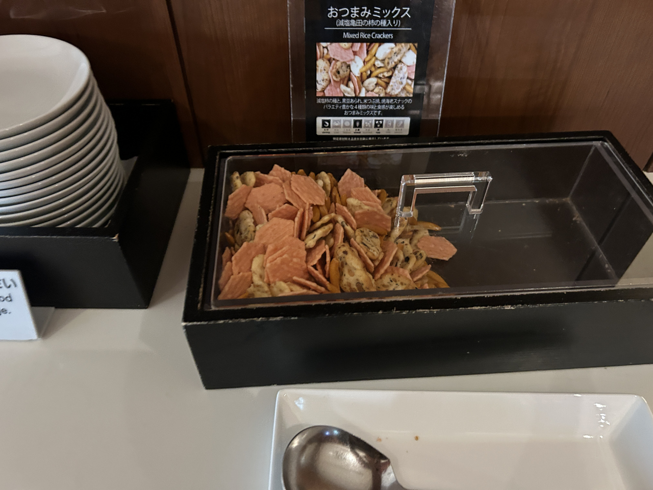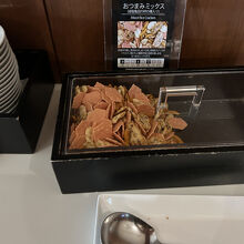 飲み物が中心で、つまめるものもあられのようなものしかありませんでした。