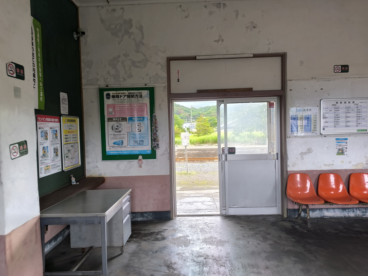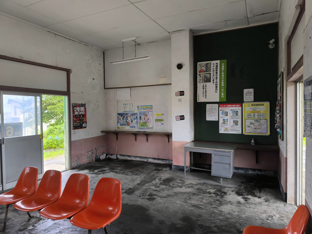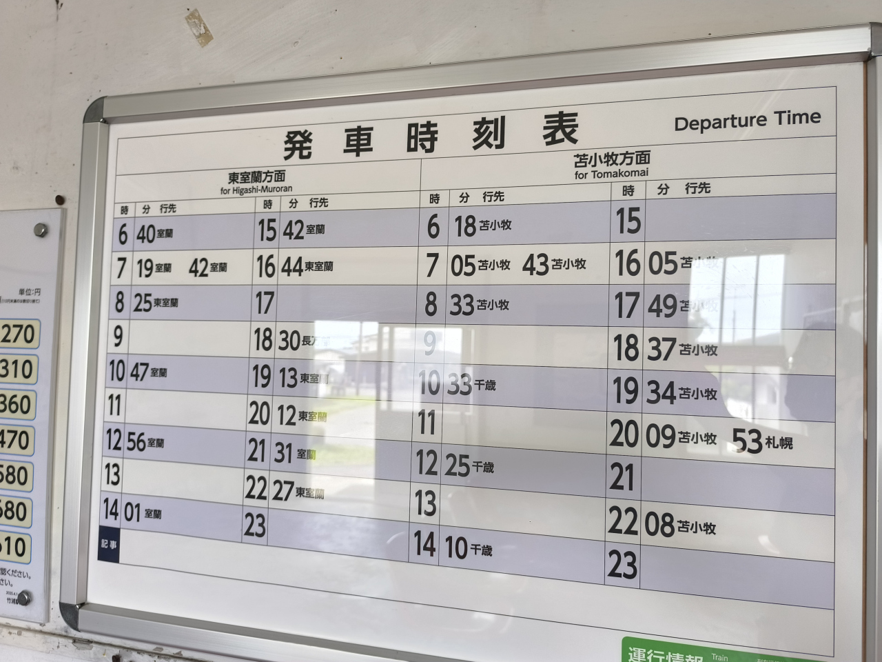 温泉利用ですが、ほとんどの人は室蘭本線と並行して走る国道36号線を車で来るため、駅を利用する人はまずいないようです。駅は無人駅で、普通列車のみが停車し、上下それぞれ1日14本ずつ、朝6時から夜22時過ぎまでおおよそ1時間に1本(午前中は2時間に1本が多い)の東室蘭あるいは苫小牧・千歳方面の列車が来ますが、それ以上に特急列車および貨物列車の通過があります。