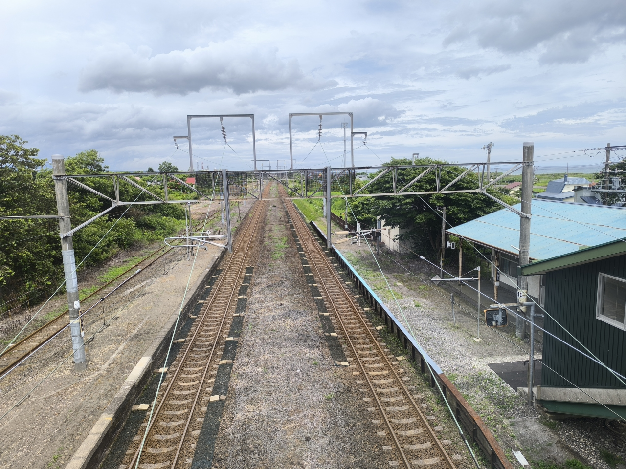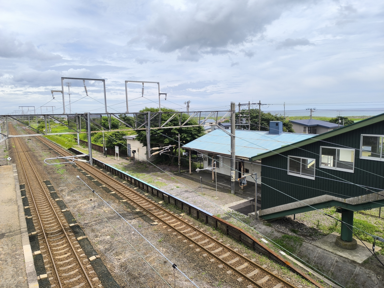 駅周辺は、太平洋と胆振地方の山に挟まれた細長い海沿いの平野に住宅地が立ち並ぶ地形ですが、人通りもほとんどなく、ひっそりとしています。ただ、平野に沿って室蘭本線や国道36号線、そして山側には道央道などの幹線道路が走っていて、国道にはひっきりなしに車が通っているので寂しくはありません。