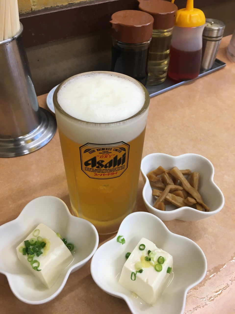 店内入ると左右に現金専用の食券機があります。ビールセットは2杯飲めお得感があり,小さな冷やっことメンマ、餃子が付いていて、メンマ、餃子が旨かったです。餃子の看板を掲げているだけあり餃子が旨かったので、ラーメンと餃子3ケ付いたセットを追加しました。ラーメンは細麺で少し爛れたような感じでしたが味は普通でした。