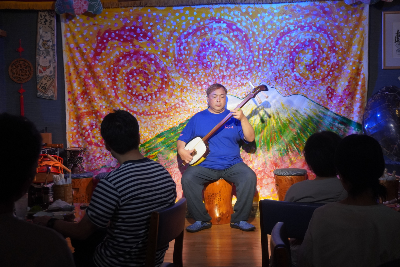 ご主人がお店のステージで何局かを熱演。三味線のあれこれのひと口知識も興味深く拝聴しました。料理の方は基本居酒屋ですが、酒を飲まない私でも十分OK。貝焼きとか地元の料理を堪能しました。