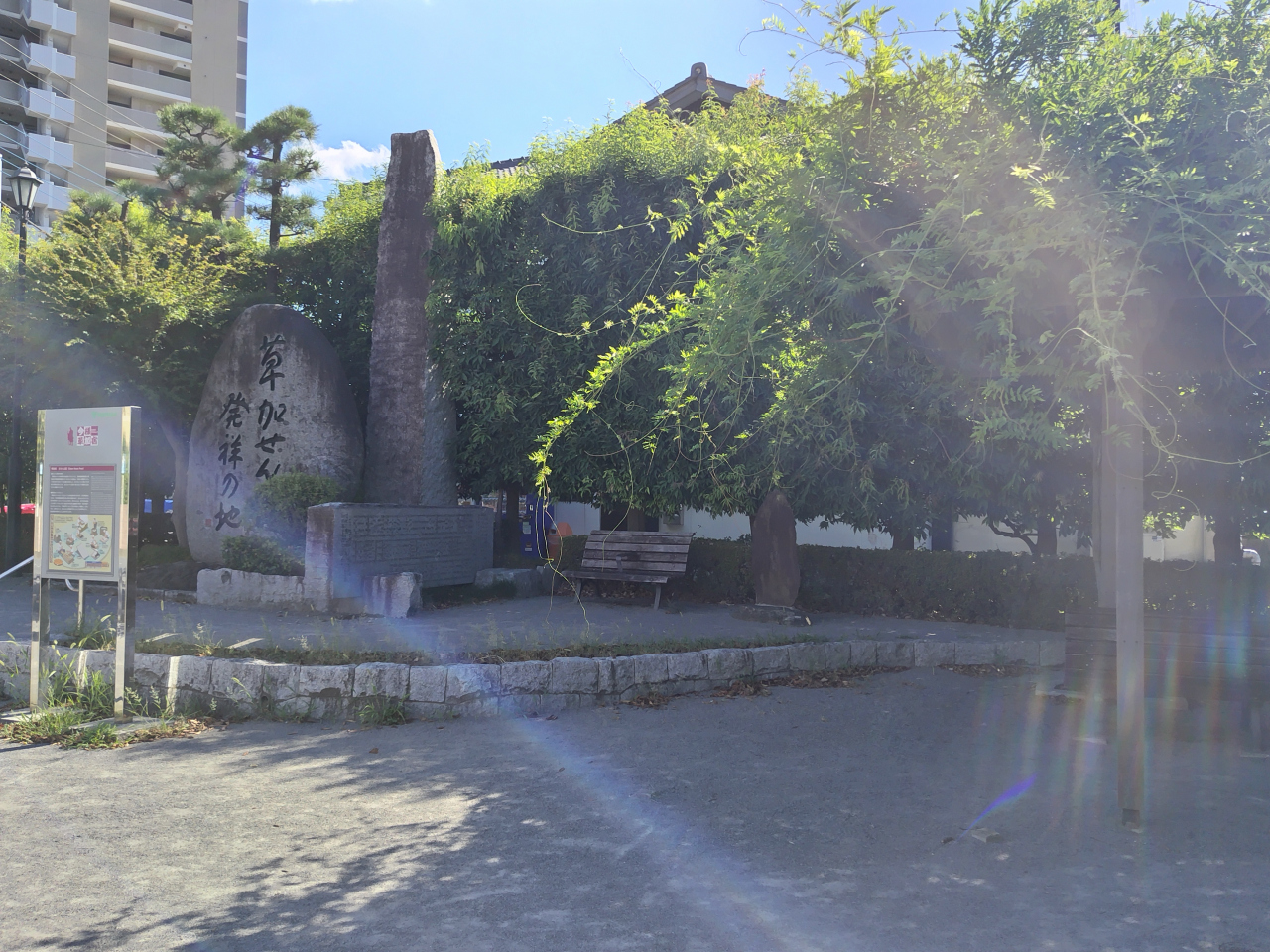 レトロな常夜燈や、草加せんべい発祥の地碑などがあります。せんべいに見立てた円形の花崗岩(高さ3.3m)と、せんべいを焼く箸に見立てた御影石(高さ5.7m)があります。