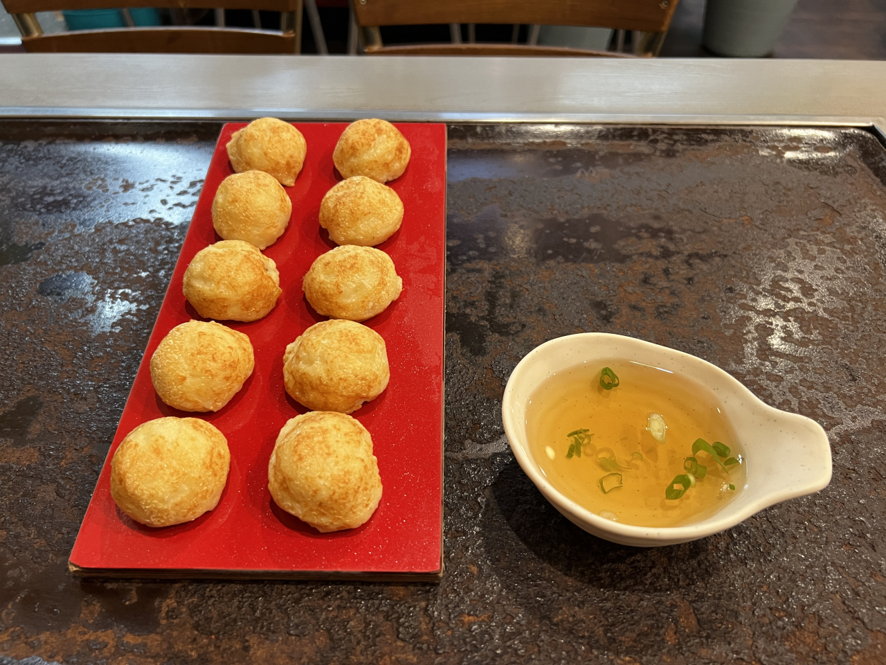 明石焼きはほくほくしてて、お出汁もおいしいです。しかし、たこ入ってる?