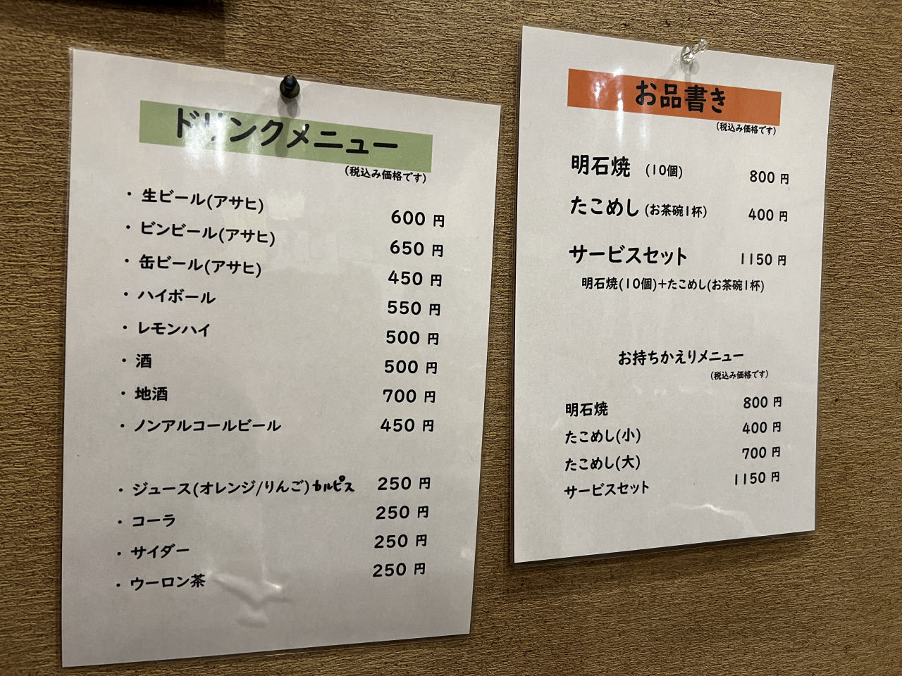 メニューは明石焼きとたこ飯のみです。テーブルには鉄板があるので、昔はもっとあったのかもです。