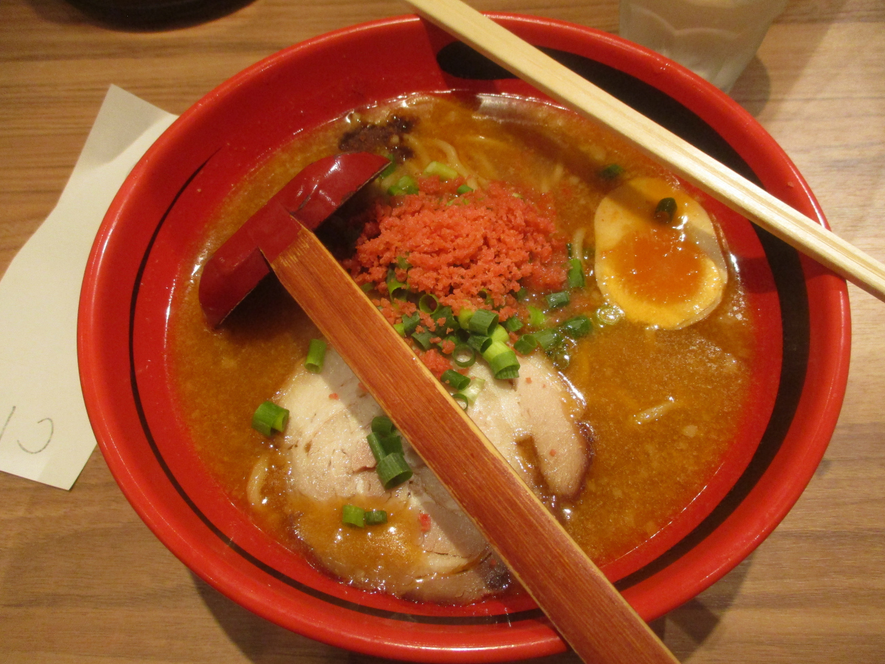 えびそば一幻 新千歳空港店のスープはみそ、しお、しょうゆの3種類から、さらにえびで取ったダシをそのまま使ったそのままか、とんこつスープをブレンドしたあじわいを選ぶことができました。組み合わせると何通りかになるので迷ってしまいましたが、定番メニューを選択しました。
