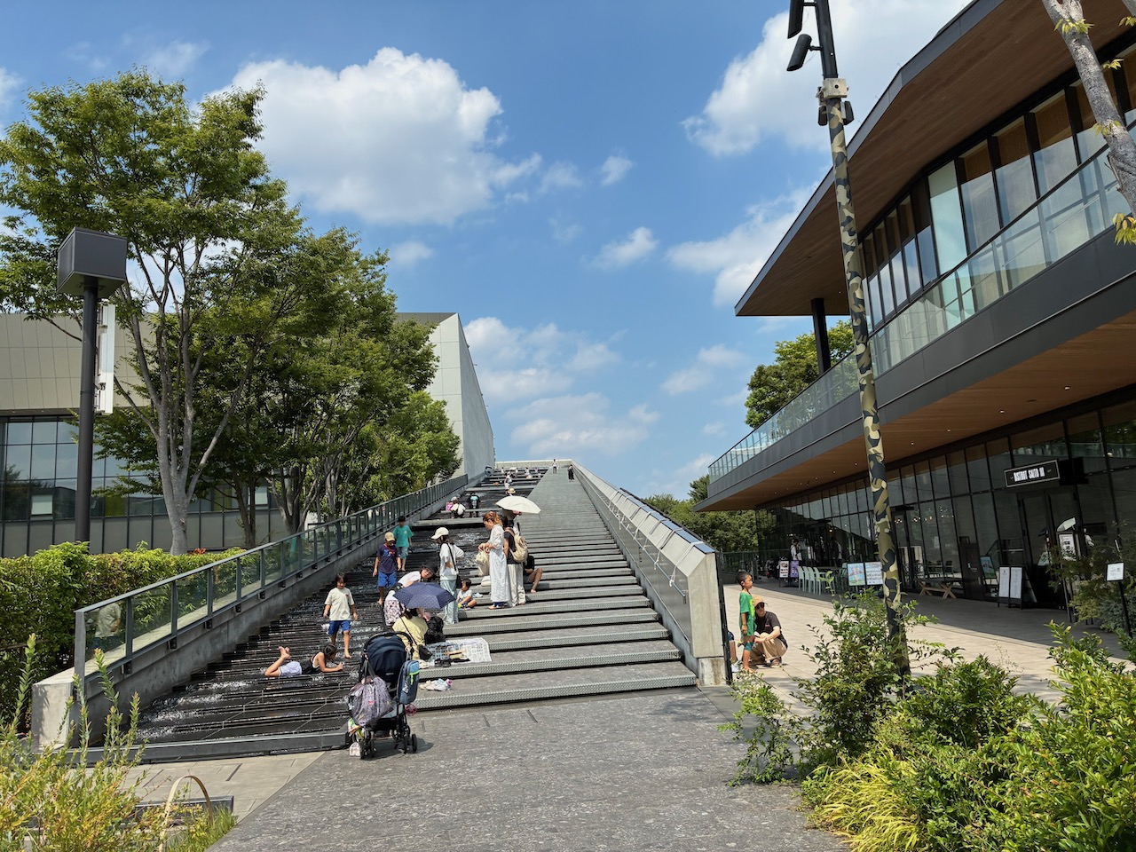 広場右手にある水の流れる階段・カスケードは、水遊びをしている子供で一杯でした。