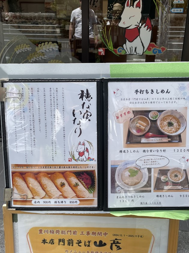 現在、門前の店舗は建て替え中。豊川稲荷の中の仮設テントで営業しています。