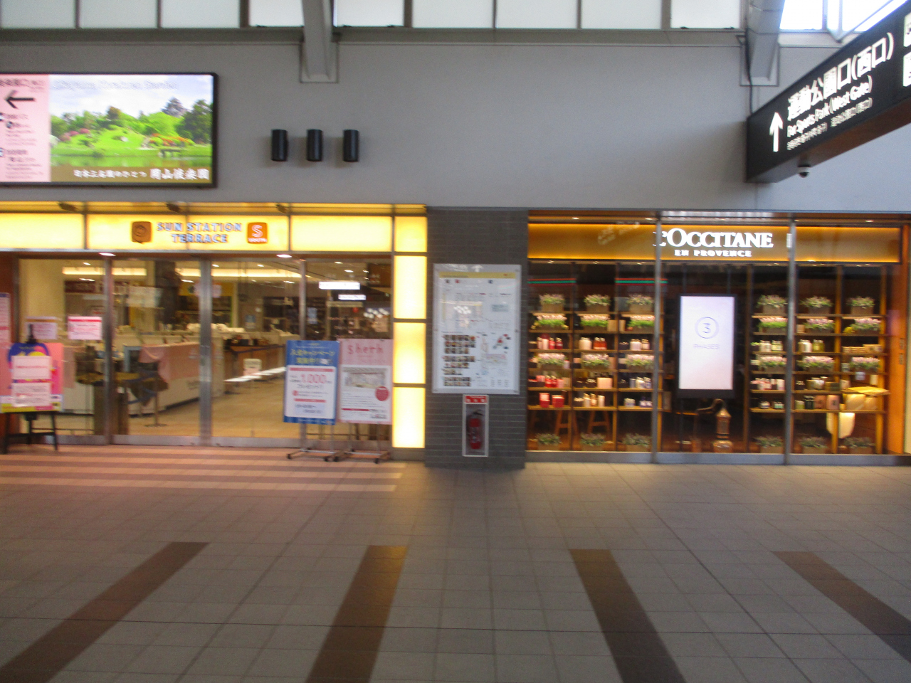 岡山の玄関口とも言える大きな岡山駅です。最近、改築されてさんすて サンステーションテラス岡山ができました。ショッピング目的で訪れる地元の人もいるようです。たくさんのショップが入っており、お土産や生活雑貨や食事の店がありました。