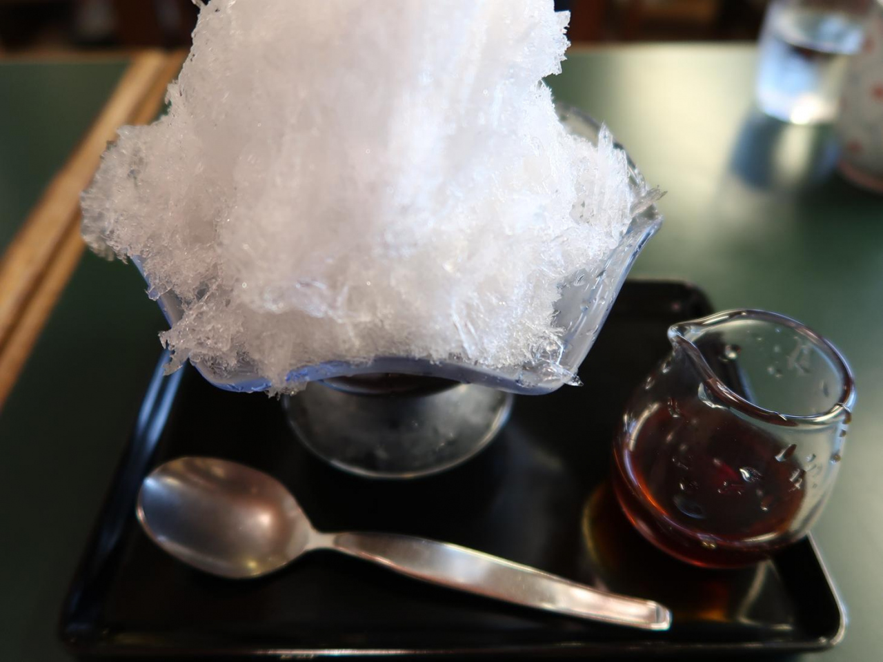 あんみつかパフェにしようかとも悩みましたが、夏限定のかき氷にして、シロップは大島(黒みつ)を選択。