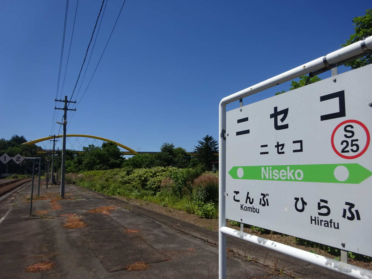 駅前には温泉や倉庫街、機関庫、ニセコエクスプレスが展示されている広場があります。