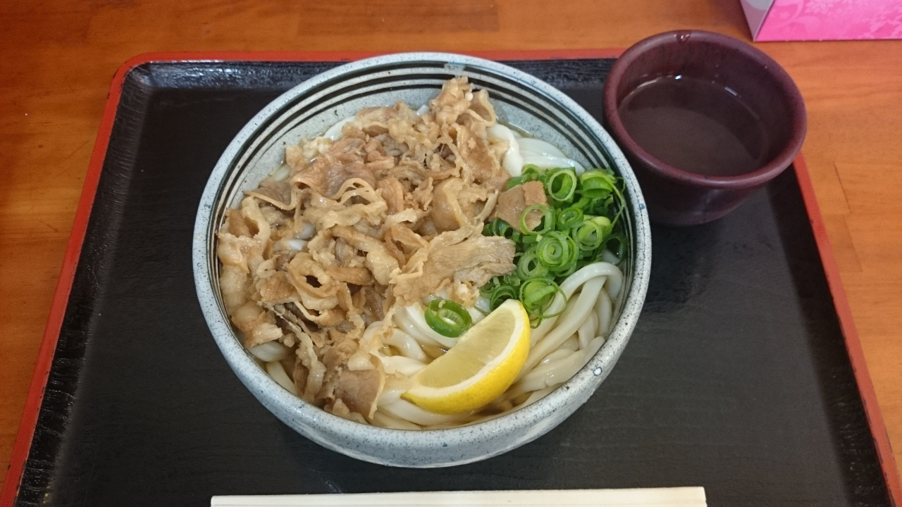 注文から下膳までセルフ方式。肉ぶっかけうどんがおすすめとのことなので、牛肉ぶっかけうどん(450円)の「ひや」を注文。「ひや」…麵も汁も冷たい、「あつ」…麺は冷たく汁は温かい、「あつあつ」…麺も汁も温かい の3種類から選べます。小でも結構なボリュームで遅めの朝食としては十分でコスパ最高。甘辛い牛肉とあっさり出汁のつゆ。そしてレモンを搾ってさっぱりとした感じでとてもおいしかったです。
