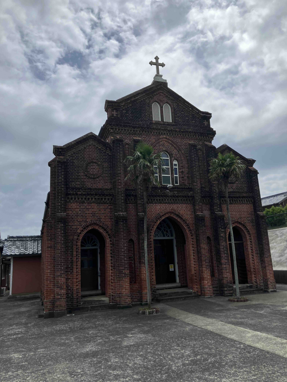 堂崎天主堂からドンドン渕を経由して車で30分ぐらいでした。レンガ造りのゴシック様式の建築で、ファサードはヨーロッパの教会のような立派なもので驚きました。キリスト教の禁教が撤去された明治時代にこんなに立派なレンガ造りの大掛かりの建物を作るのはさぞ大変だったと思います。教会の近くには楠原牢屋跡があり、キリシタン迫害の歴史を感じます。