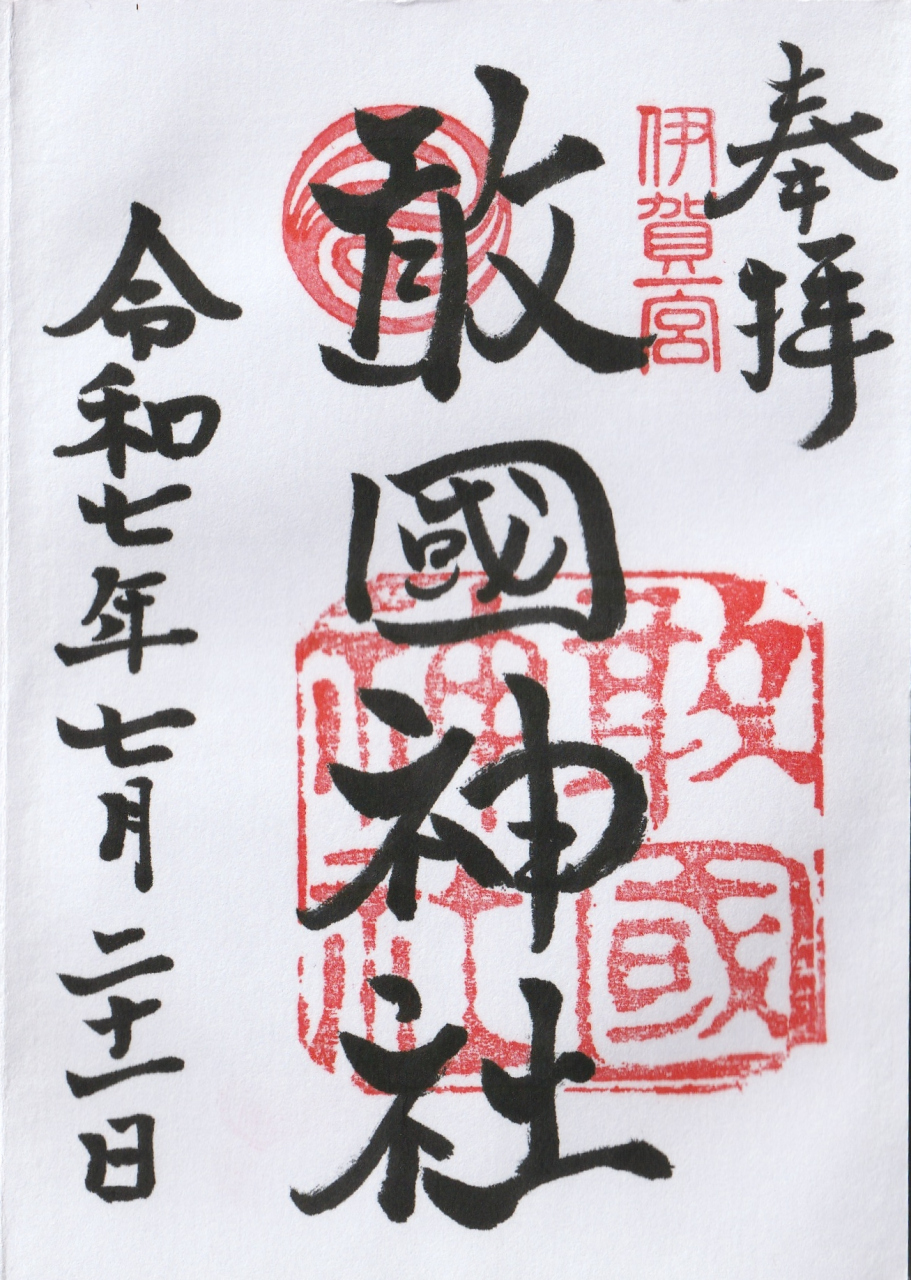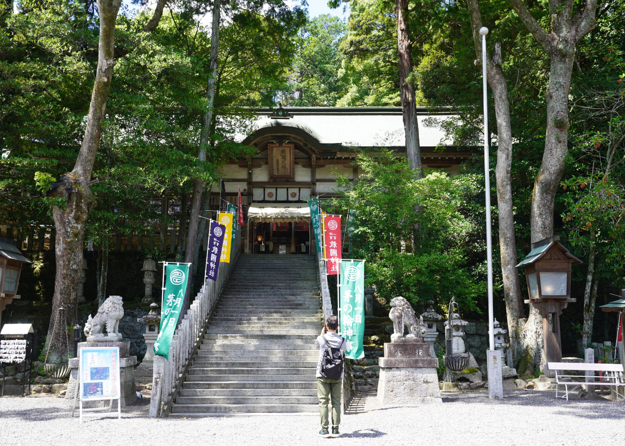 奈良旅行の帰りに寄りました。名阪国道の伊賀一之宮ICで降り5分ほどで敢國神社に到着。広い駐車場あります。敢国神社の駐車場からは、表参道と裏参道の入口が並んで見えます。表参道を歩いて神社へ向かい、帰路は裏参道を使いました。敢国神社は、神奈備山・南宮山を遙拝する形で鎮座しています。飛鳥時代の658年に創建されたと伝わっており、奈良時代にこの地に大きな勢力を持っていた安部氏(敢氏)の氏神をお祀りするようになりました。その後、875年(貞観15年)には延喜式内大社に位置づけられると、伊賀国一宮として今に至ります。本殿は一段高いところにあります。お参りして御朱印を頂きました。帰りは裏参道を歩きましたが、いくつか摂末社がありました。