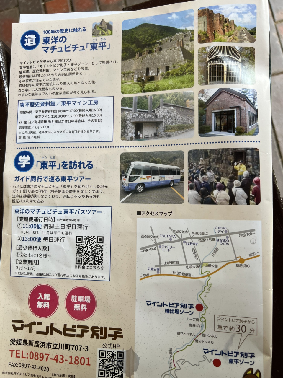 愛媛県新居浜市の松山自動車道を降りて車で10分ほど。途中に別子銅山記念館があり、通り過ぎて橋を渡ると見えてきます。温泉施設やレストランなどが別子銅山跡地にあり、駐車場代は無料でした。さらに奥に行くと、東平(とうなる)という採掘坑の跡地があり、住民の住宅跡地は上から見下ろすと、「東洋のマチュピチュ」と言われています。日本の銅の歴史が分かる有意義な施設です。東成への道は極めて狭い山道で運転が苦手な人には難しいかも。下から有料にバスが出ています。