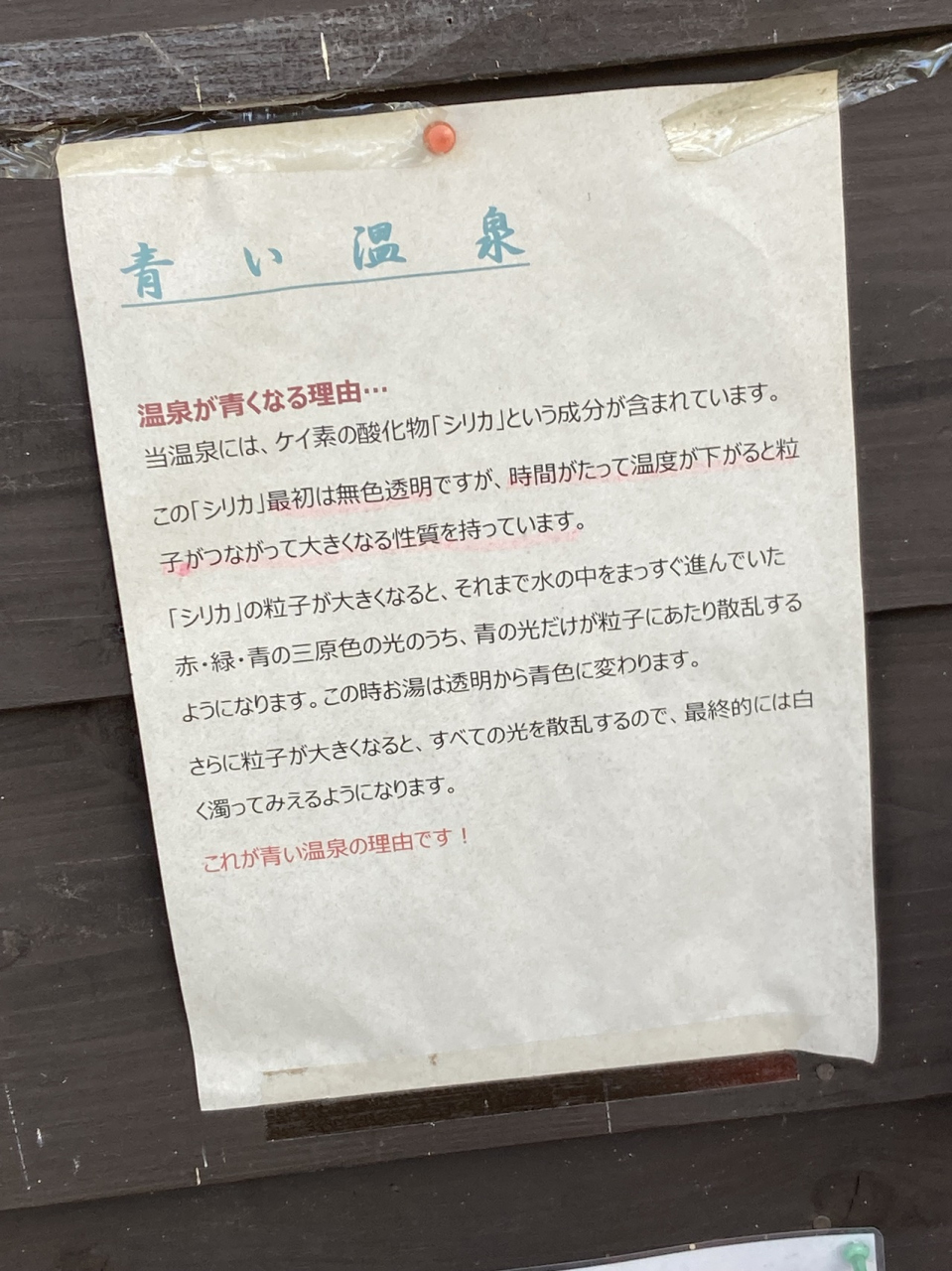 「青い温泉の理由は、温泉に含まれるシリカが関係しています。シリカはもともと無色透明ですが、時間が経ち温度が下がると粒子が大きくなり、光を散乱させます。青い光だけが散乱するとお湯が青色に見え、さらに粒子が大きくなると全ての光が散乱し、白く濁って見えるようになります」。