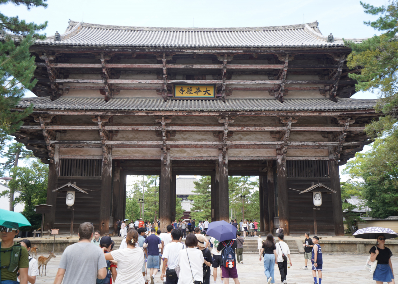 大仏殿・・・国宝の本尊盧舎那仏(大仏)を安置する、東大寺の金堂。廻廊と中門に囲まれた壮大な建築で、間口約57m・奥行き約50m・高さ約48m。江戸時代の再建で創建時より間口が3分の2に縮小されていますが、それでも高さや奥行は創建時のままで、世界最大級の木造建造物です。