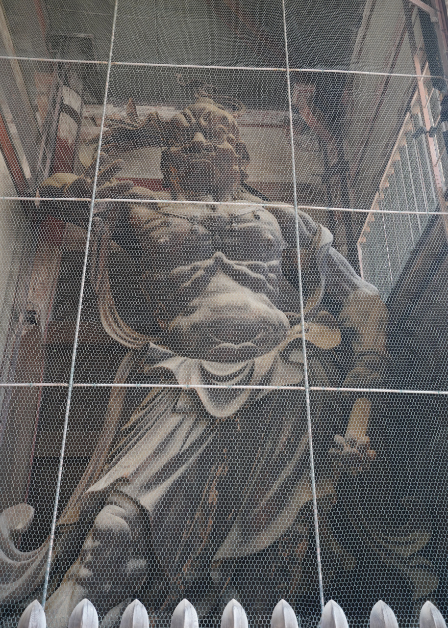 国宝の南大門・・・鎌倉時代に再建されたもので、その高さは約25メートルもあり、日本最大級の山門になります。長年風雨に耐えてきた木材の古色が威厳を感じさせます。門の中には、運慶、快慶ら慶派の仏師が1203年に造立した「金剛力士像」が安置されています