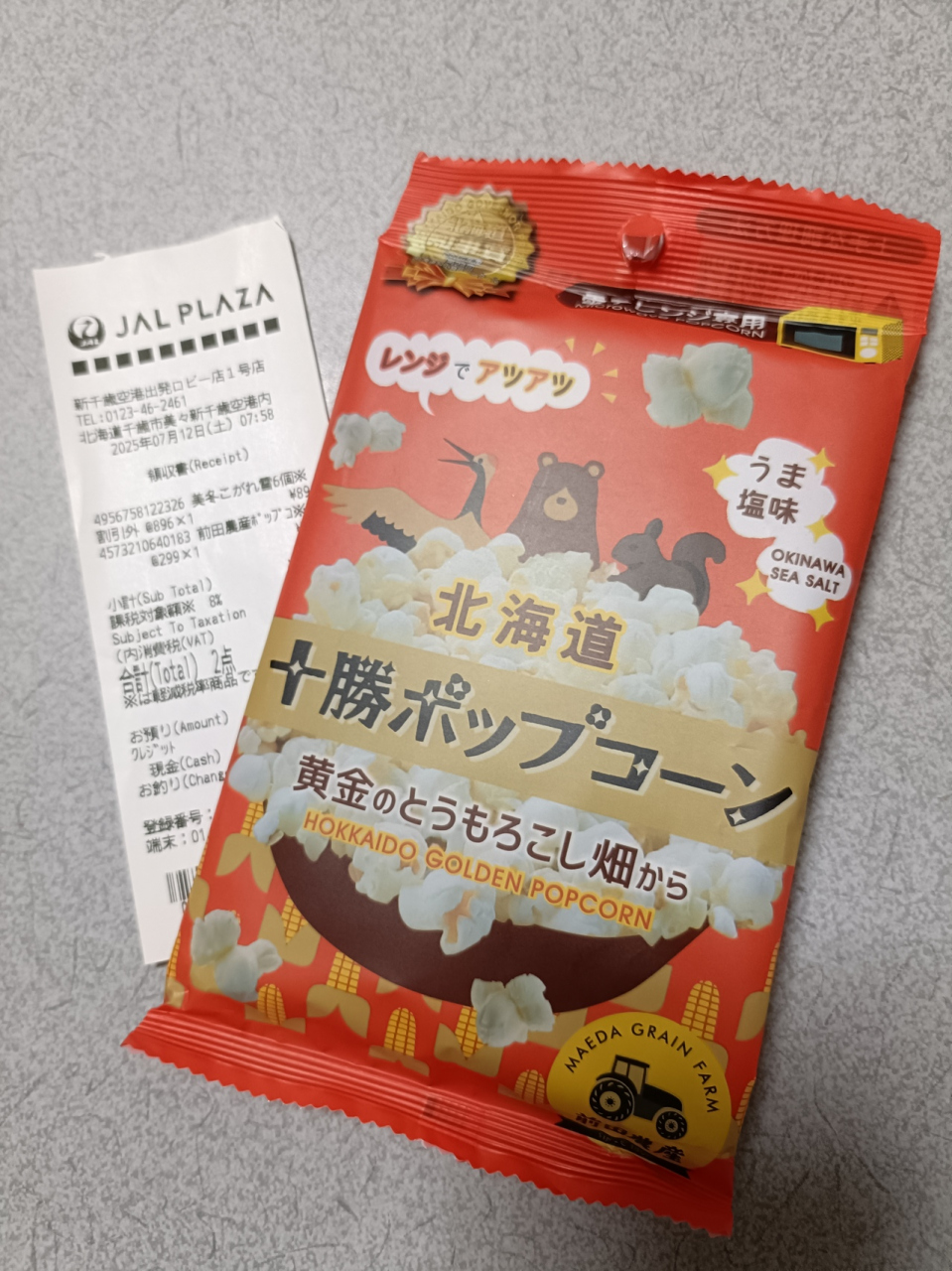 JALカード利用、1年ぶりの新千歳空港JAL PLAZA、カカオ高騰を実感、チョコレート製品が高くなっているのにびっくり‼️でした。とりあえず石屋製菓の美冬こがれ雪(ミルフィーユ)とレンジ用ポップコーン購入しました。