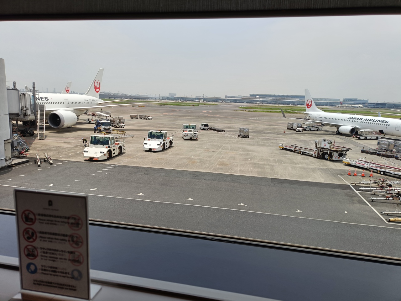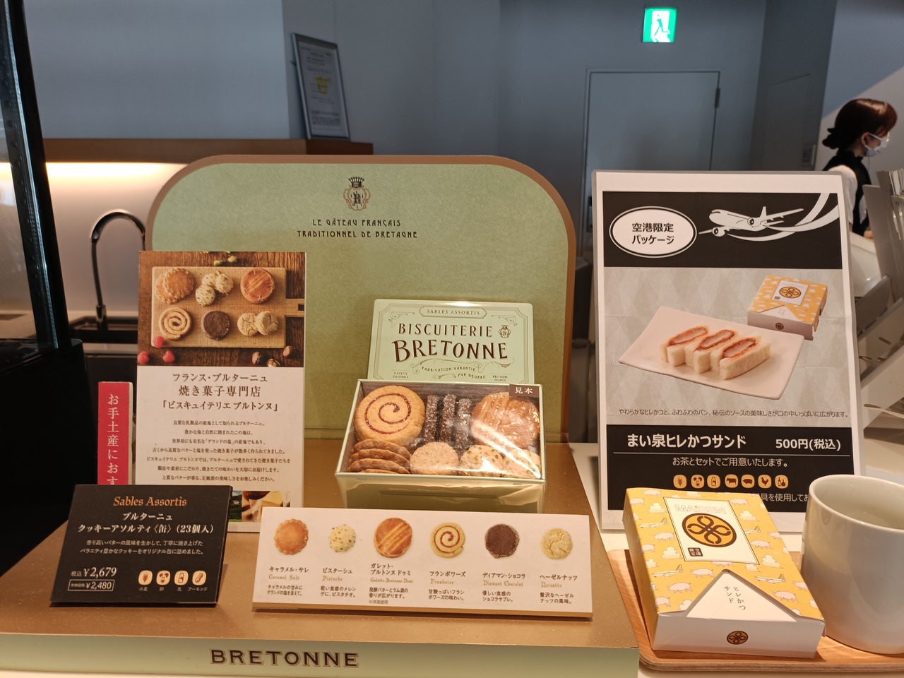 発着する飛行機見ながら、ほっと一息出来るので、搭乗前に必ず立ち寄ります。受付カウンター横に、飲食用まい泉カツサンドやクラフトビール、お土産用にフランス.ブルターニュにある焼き菓子専門店のクッキー詰合せ販売されてました。