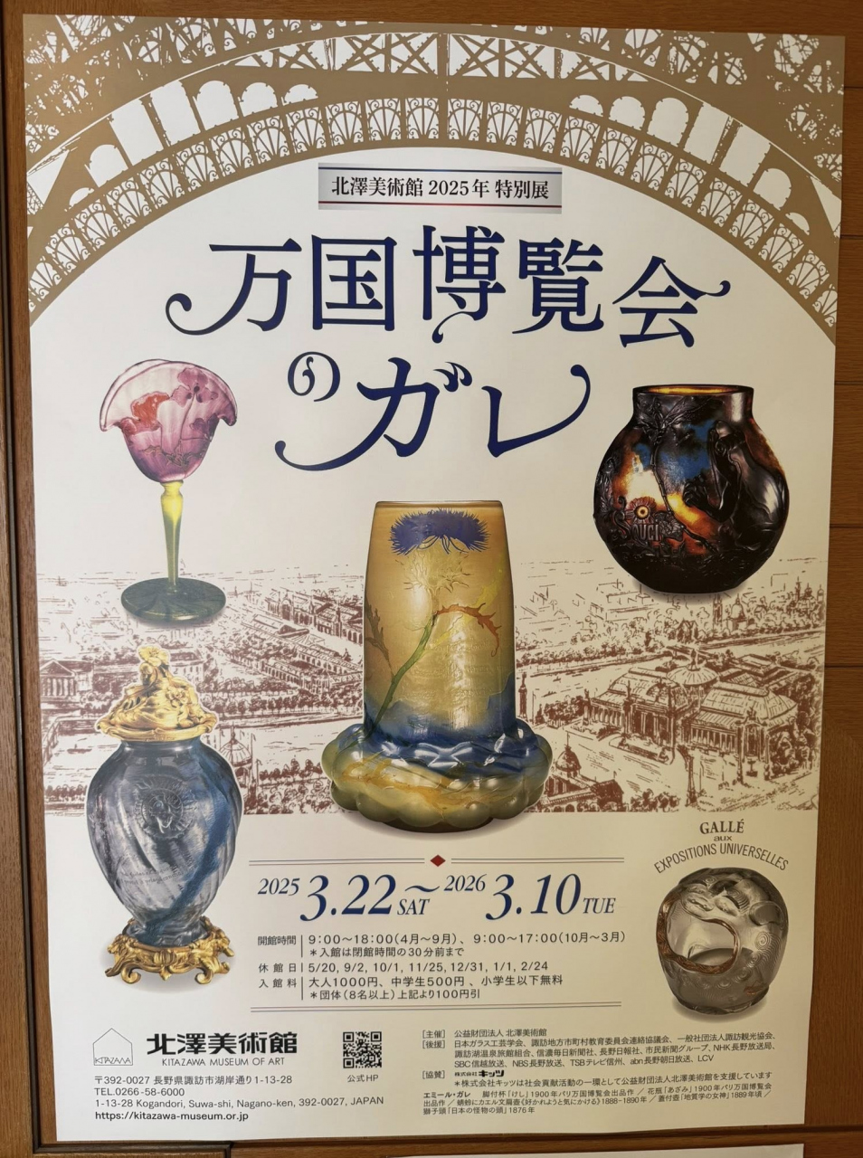 2階の現代美術展は写真撮影不可ですが1階の素晴らしいガレの作品は撮影できます。本物が持つ輝きの素晴らしさを感じることができる美術館、入館料1000円は高いとは思えない充実の内容です。隣接してサンリツ服飾美術館があります。