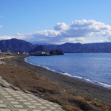 島郷海水浴場は、沼津御用邸記念公園の南側にあるビーチ。沼津御用邸記念公園の裏側の海沿いの堤防道を行くと見えてきます。ビーチ自体は普通の砂浜。何ということはありませんが、堤防道の方は長い距離をかなりしっかりと整備されていて、散歩をしている人がちらほらいて、地元の人には親しまれている場所なんだなと感じました。