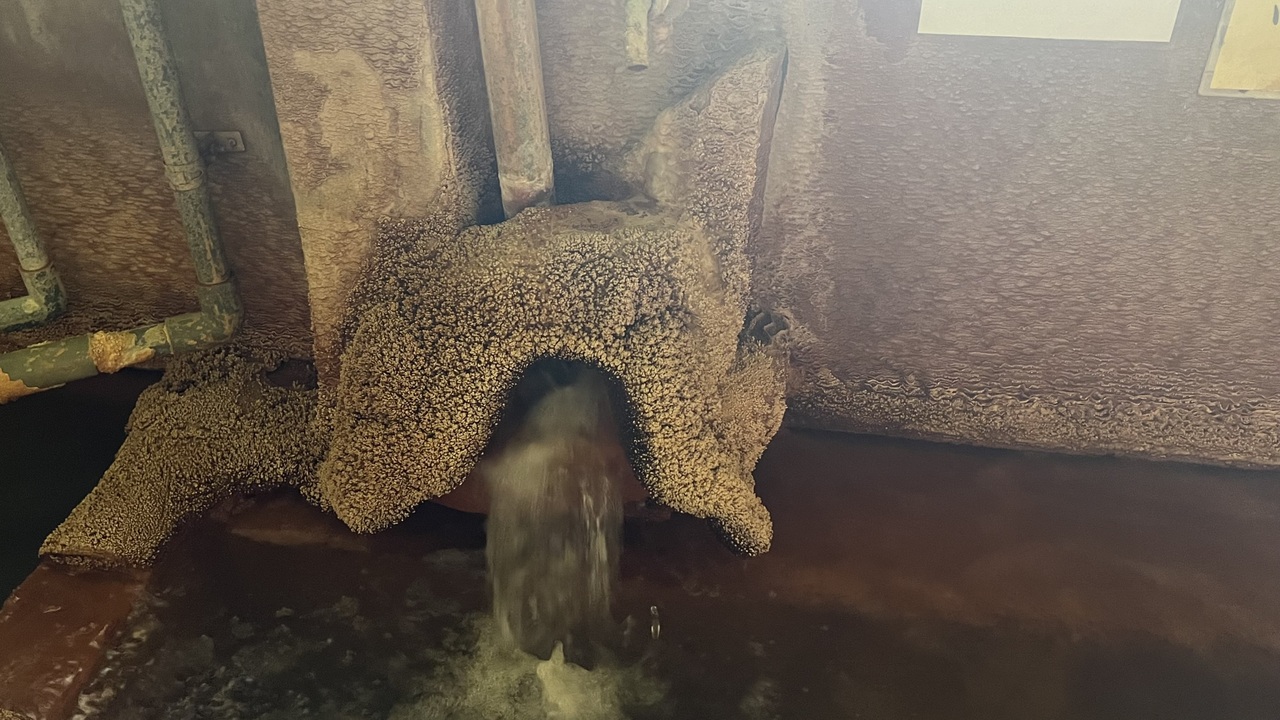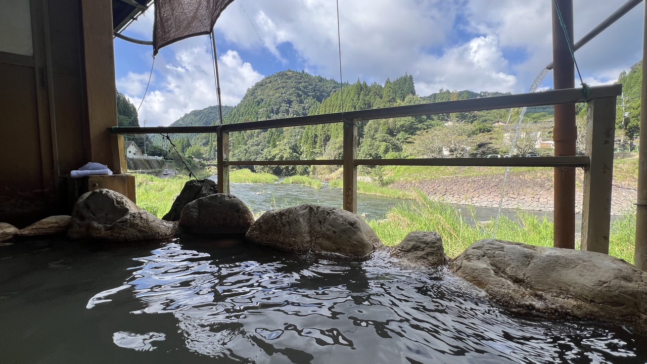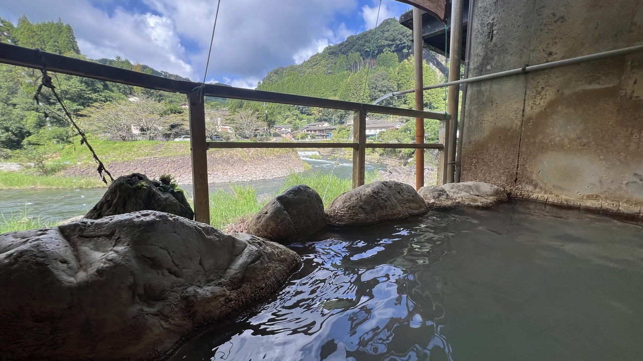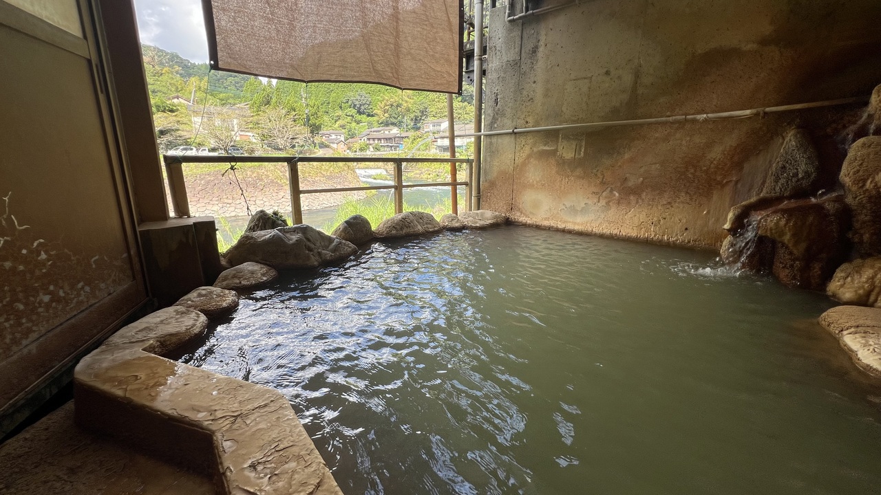 昔から時が止まったような建物ですが、温泉はとても成分の濃く、勢いよくかけ流されていました。注ぎ口には珊瑚礁のように温泉成分が固まっています。男風呂には露天風呂があり、天降川を見ながらのんびり入ることができます。