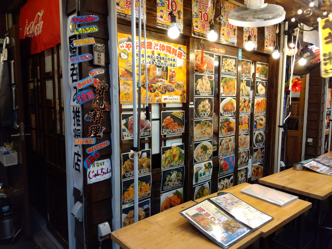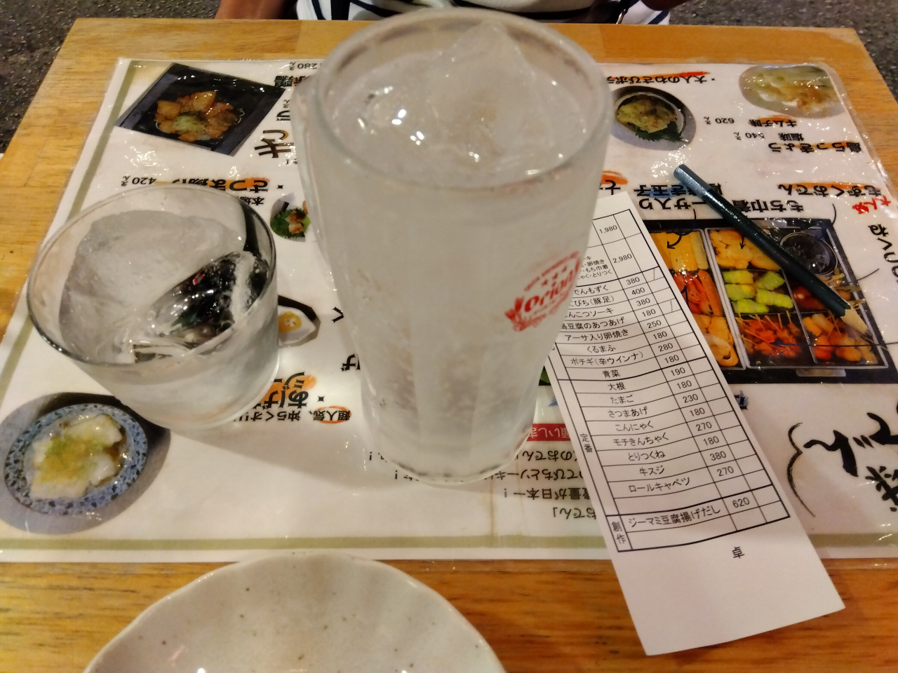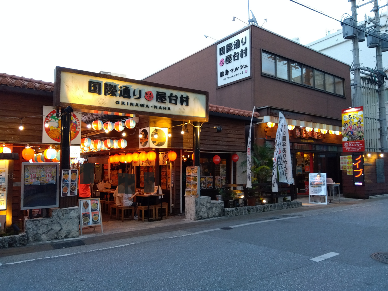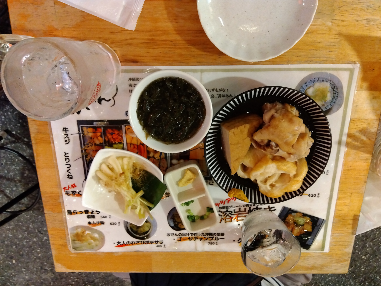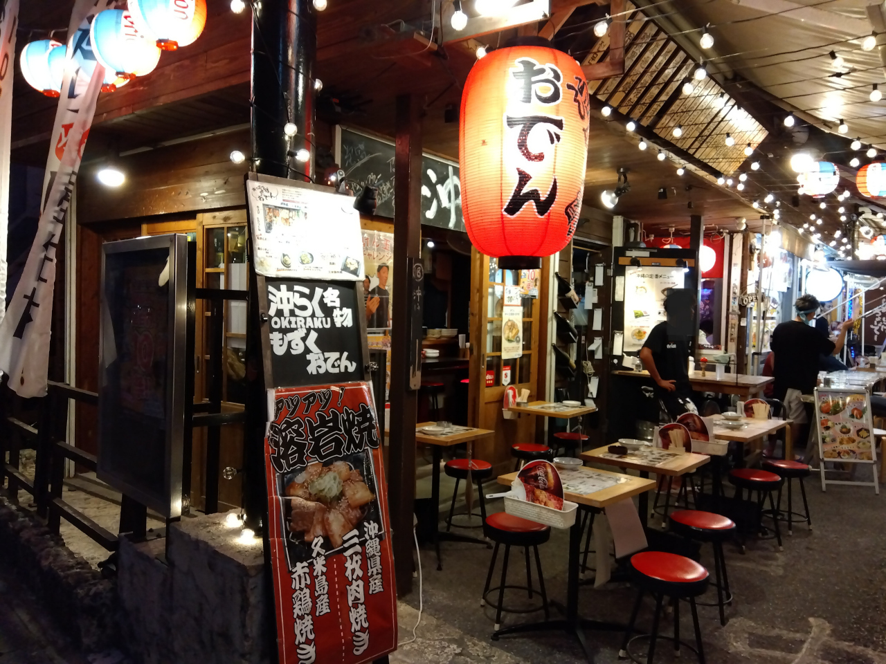「屋台村じゅんちゃん」(屋台番号16番の沖縄料理とヤギ料理)と「沖らく」(屋台番号18番の琉球おでん)の二軒をハシゴしました。