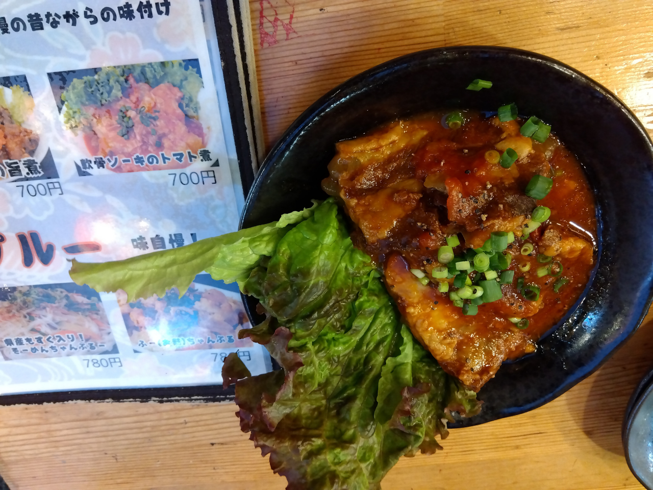 「屋台村じゅんちゃん」では、「海鮮フェア」の「セーイカのバター醤油炙り」が無くて残念、目に止まった「軟骨ソーキのトマト煮」はこってりしたトマトソースが柔らかいソーキによく絡んで絶品、生ビールにもよく合いました。