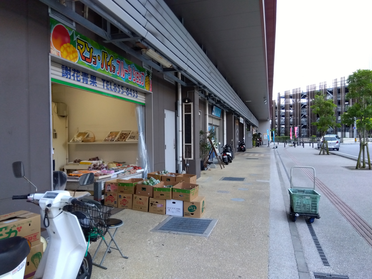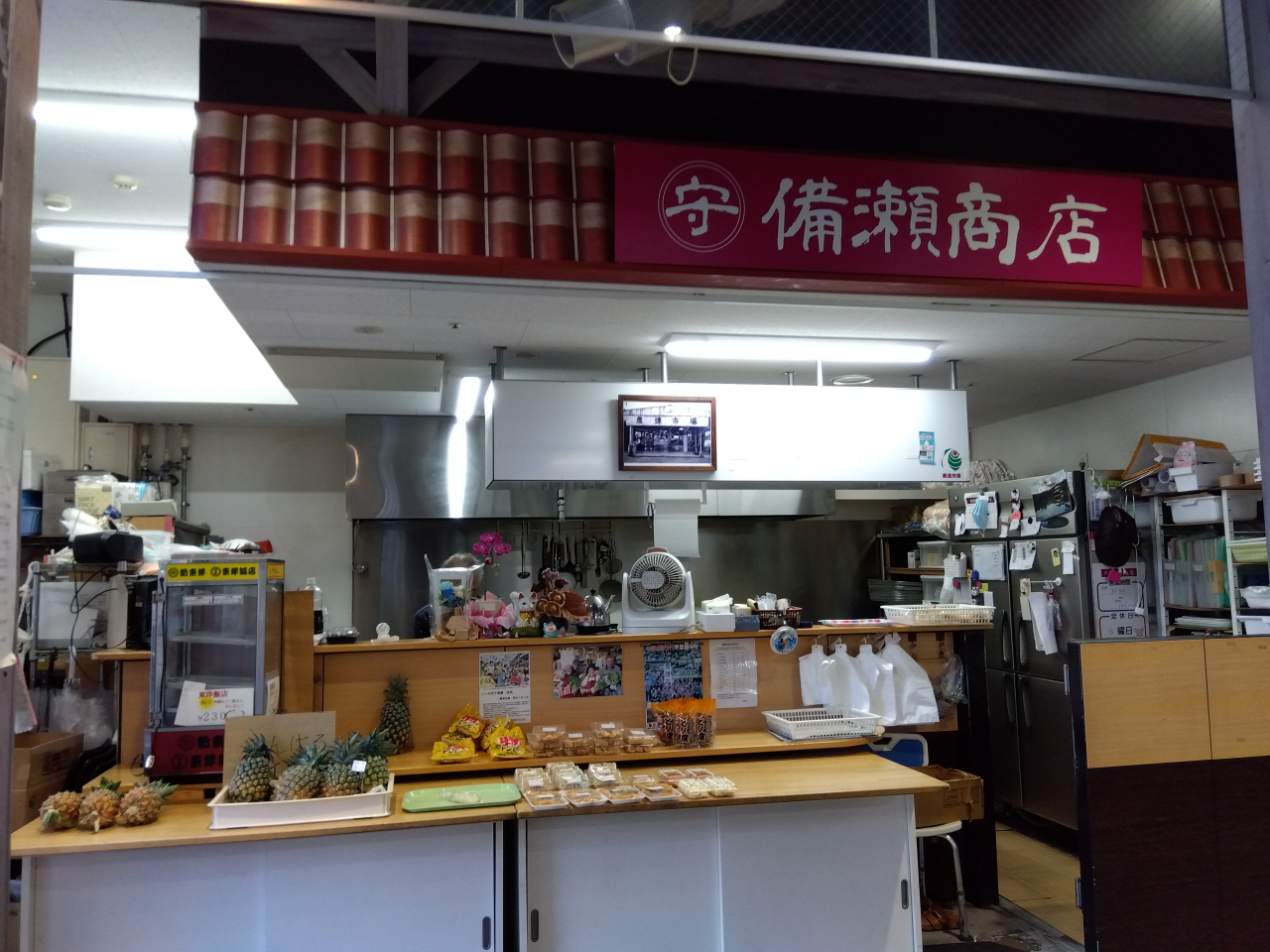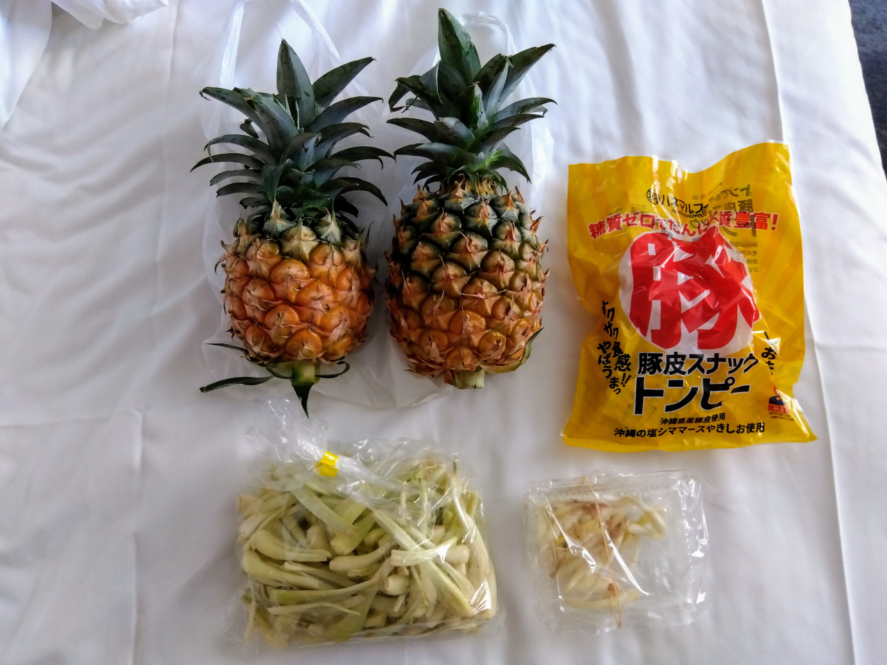 「農連野菜売場」(早朝ゾーン)の惣菜店「備瀬商店」には、パイナップル、豚皮スナックトンピー、鶏皮、惣菜が並んでいました。パイナップルと豚皮スナックトンピーを購入しました。