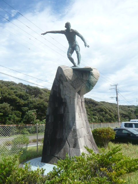 新島空港の駐車場には、サーフィンの像が設置されていて、本土から、数多くの観光客や競技参加のための選手がやってきます。