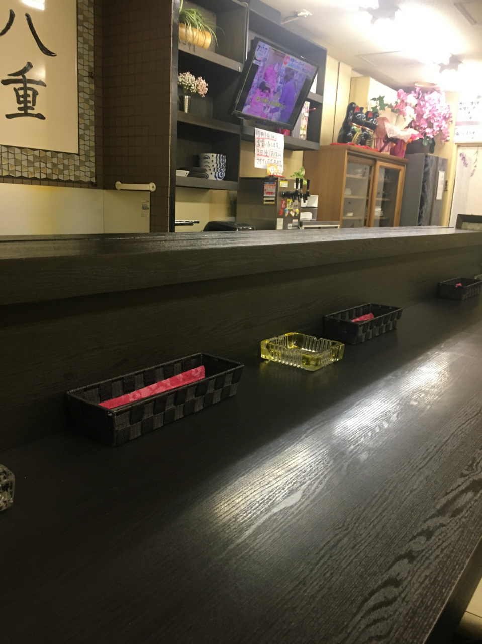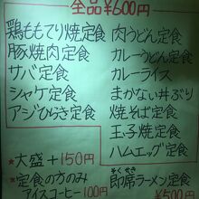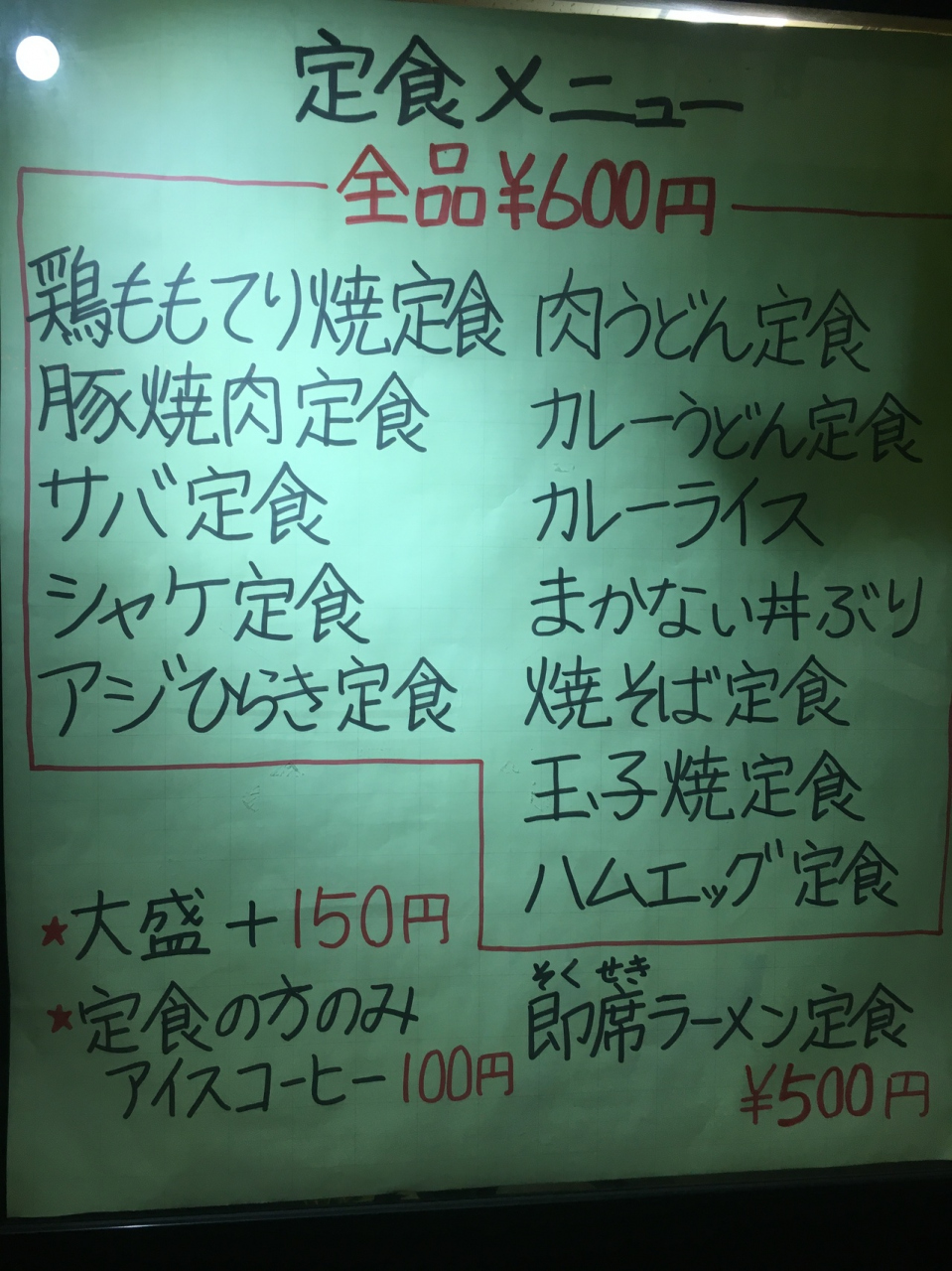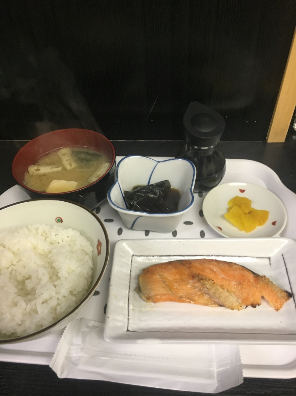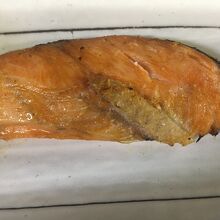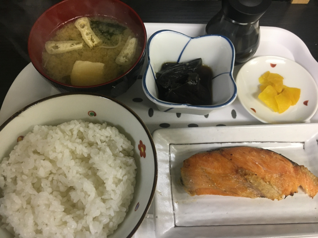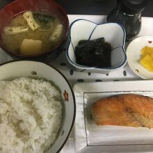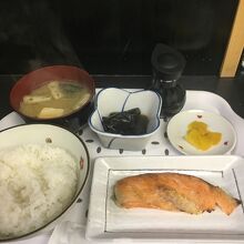 朝6時30分に訪問。すでに4人の客がいました。シャケ定食を注文。シャケの他にナス、ご飯、味噌汁が付いている家庭的な味付けでした。カウンター席で食べましたが奥にもテーブル席がありました。地元密着型の店でした。