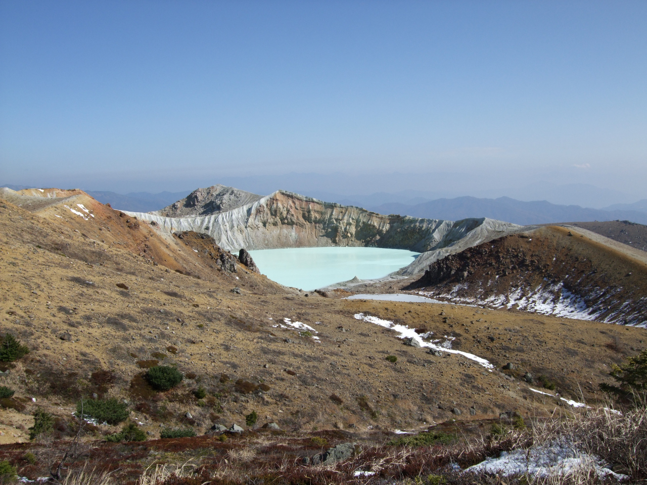 草津温泉から白根山まではバスで約30分。温泉地のそばにあるお釜では蔵王が有名ですが、向かう道路からの眺めはこちらの方が随分と雄大です。スキー場を抜けて、広葉樹林を抜けて、白根山のごつごつした岩の渓谷を登っていく景色は、なかなか味わえないスケールだと思います。終点で降りて、その後は、さらに歩きで30分くらい。これも北アルプスを遠くに望める場所があったり、湿原を見下ろしたり、変化に富んでいます。そして、この湯釜。コバルトブルーの輝く湯釜は、掛け値なしに感動ものです。