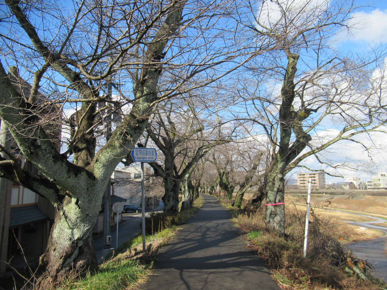 福井駅から15分ほど歩いて九十九橋にやってきました。足羽川を渡ると土手の遊歩道の両側に桜が植えられている足羽川桜並木がありました。訪れたのが1月下旬で、ごく小さな硬いつぼみがありました。太い幹の木もあり、一部の木々にピンクの帯が巻かれていて、枝の伐採が行われた跡がありました。切った木々が太さ別に束ねられて斜面に置いてありました。花が咲くときれいな景色になるのだろうと想像しながら泉橋まで歩きました。