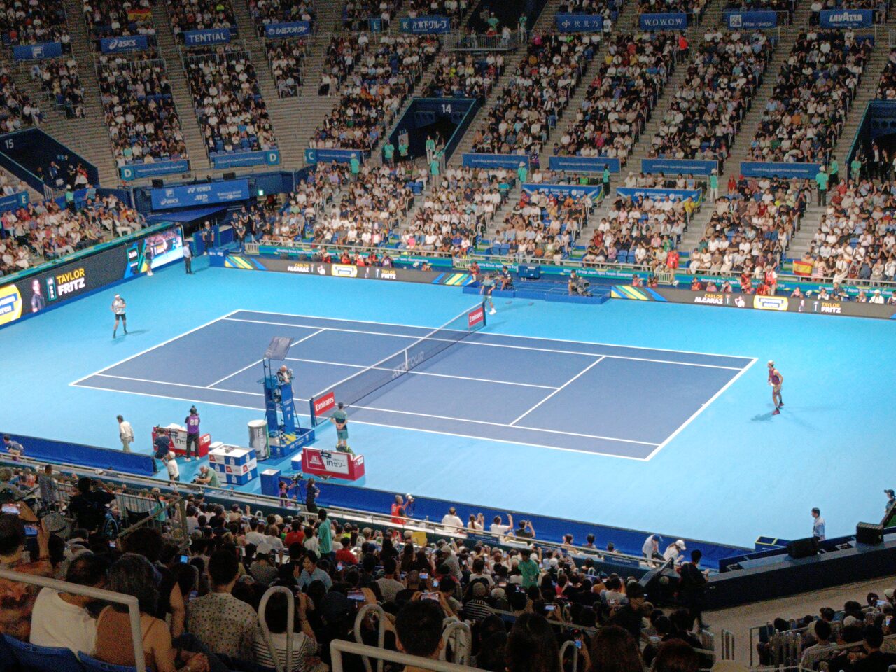 娘に誘われ、木下グループのジャパン·オープン·テニス決勝戦を見に行きました。テニス初観戦、コートから1番遠い最上段(Xブロック32列18番)の席でしたが大満足、¥1000+発券手数料はコスパ◎。コートが横長に見える席で、ライブ等に比べれば、とても近く感じました。その上、ダブルスの試合時は運良く日陰でした。シングルスのアルカラスとフリッツの試合は見応えありました。又、行く機会あればルーフトップ購入するでしょう。屋台やスポンサー·記念グッズのショップもあり外も賑やかでした。
