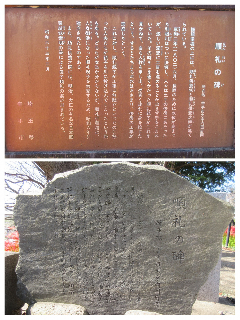 享和2年(1802)六月、長雨で決壊した利根川の修復工事が進まず困っていた時、通りかかった順礼親子が見かねて、自ら人柱を申し出、逆巻く流れに身を投じたことで洪水がおさまって、工事も完成したという言い伝えがあるそうです。