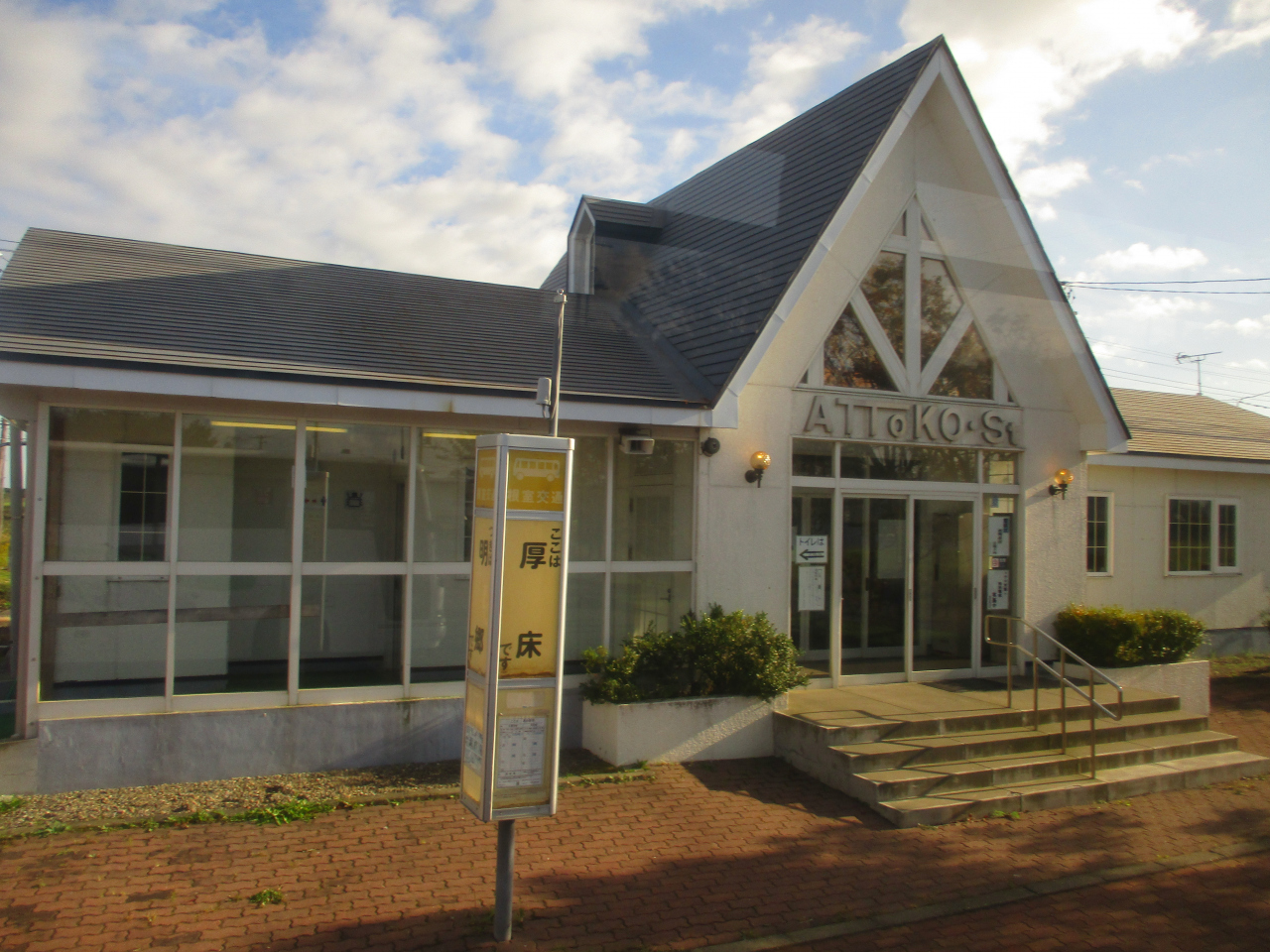 厚床駅はかつて標津線の分岐駅でしたが、同線が廃止され、さらには駅員無配置化、交換設備廃止と、寂しくなってきている気がしました。駅舎内にはしっかりとした窓口がありましたが、地域の路線バス(根室交通)のもので、JR券の発売はできませんでした。