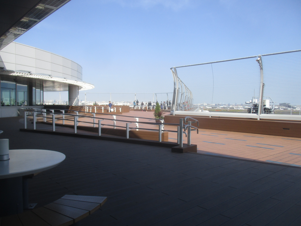 羽田空港 国際線旅客ターミナルには休憩用の椅子がたくさんありますが、私は展望デッキにある椅子がいちばん好きです。天気の良い日は周囲の景色を眺められますし、雨が降っている日は軒がありますので、濡れずに見学できるところがGoodです。