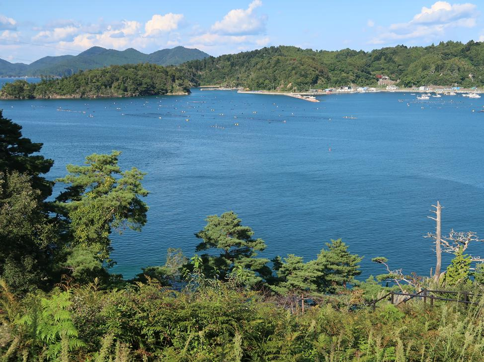 私はまず、橋の両側のたもと近くから、海に落ち込む崖や、小島が浮かぶ女川湾が絵になる景色を眺めてみました。