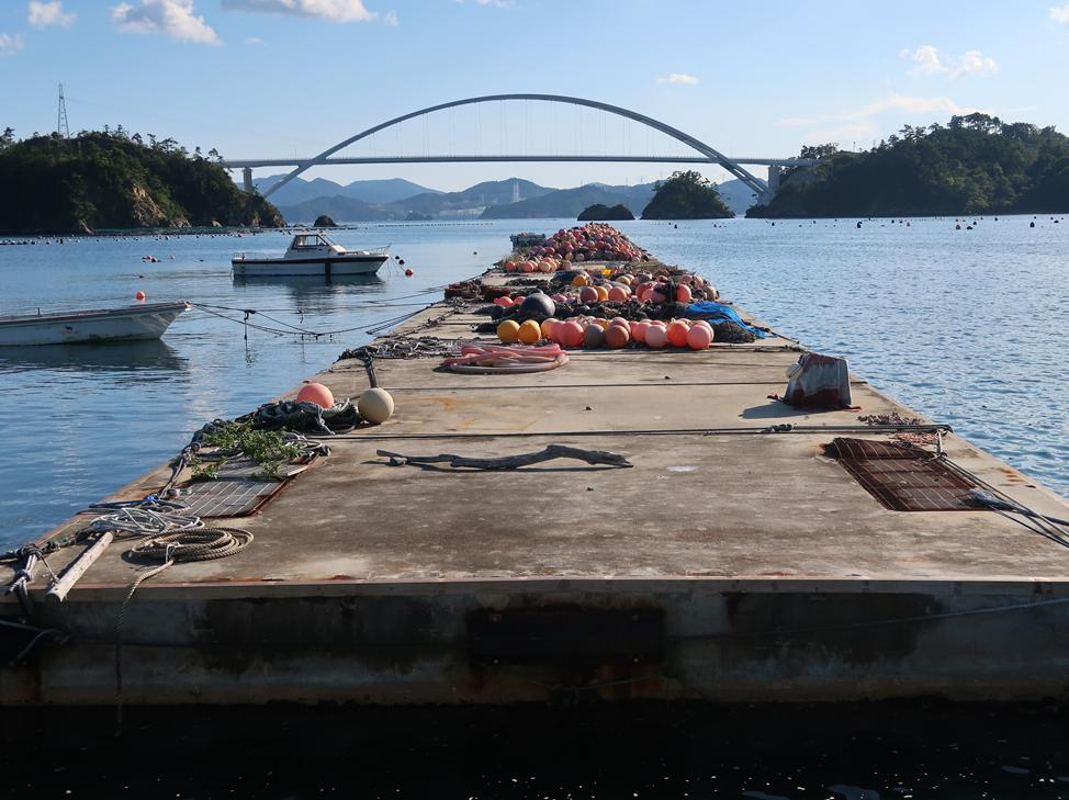 橋を渡った後、出島北部の出島港へ行くと、そこからは橋の遠景と港の風情が一緒になった様子が風情あり。