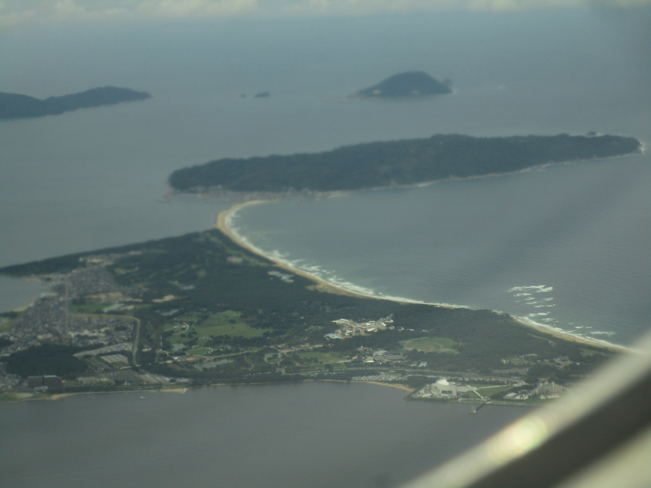 帰りの飛行機の中から博多湾と玄界灘に囲まれた砂州状の「海の中道」にある広大な国営や志が島を眺めることができました。