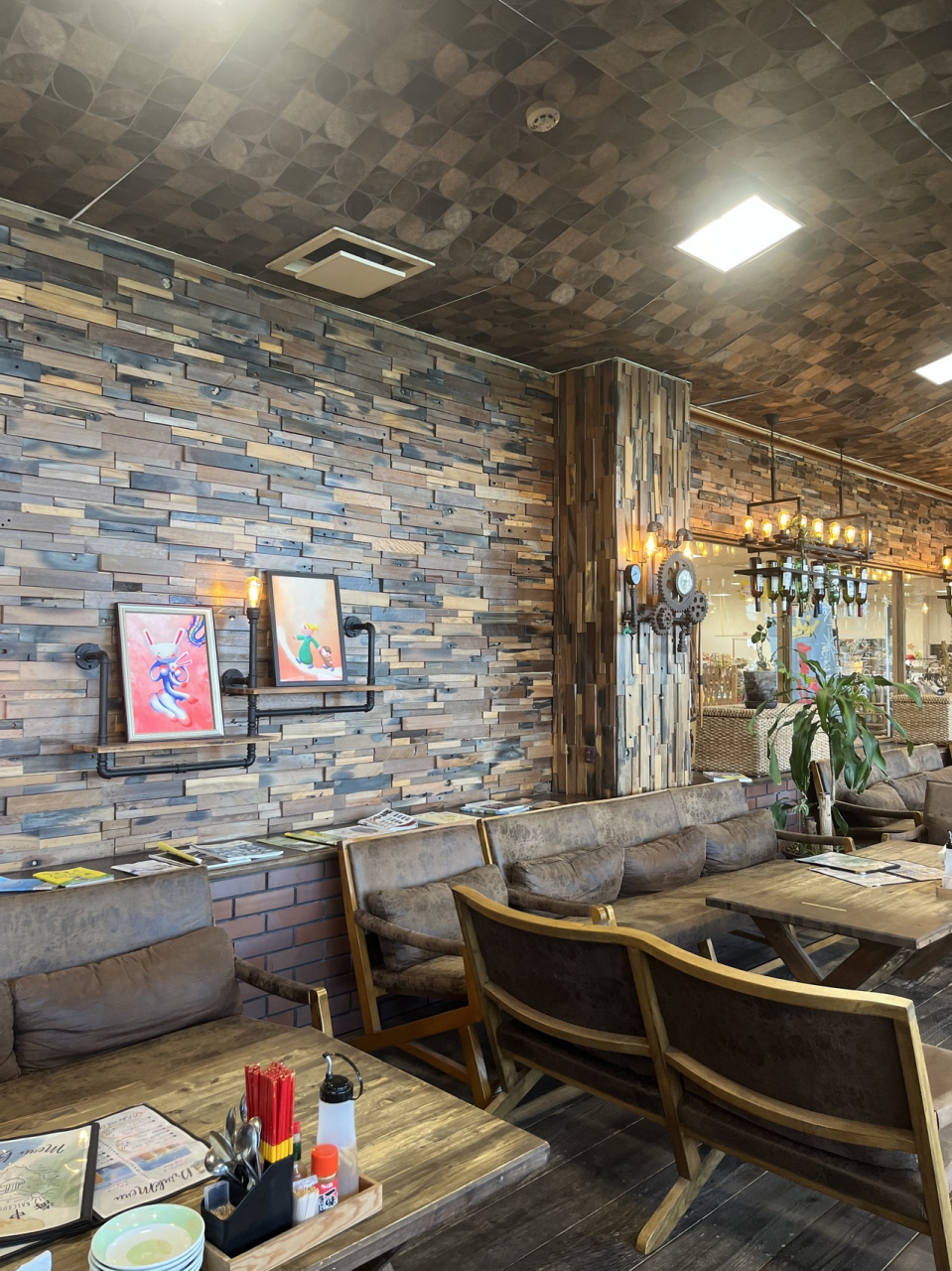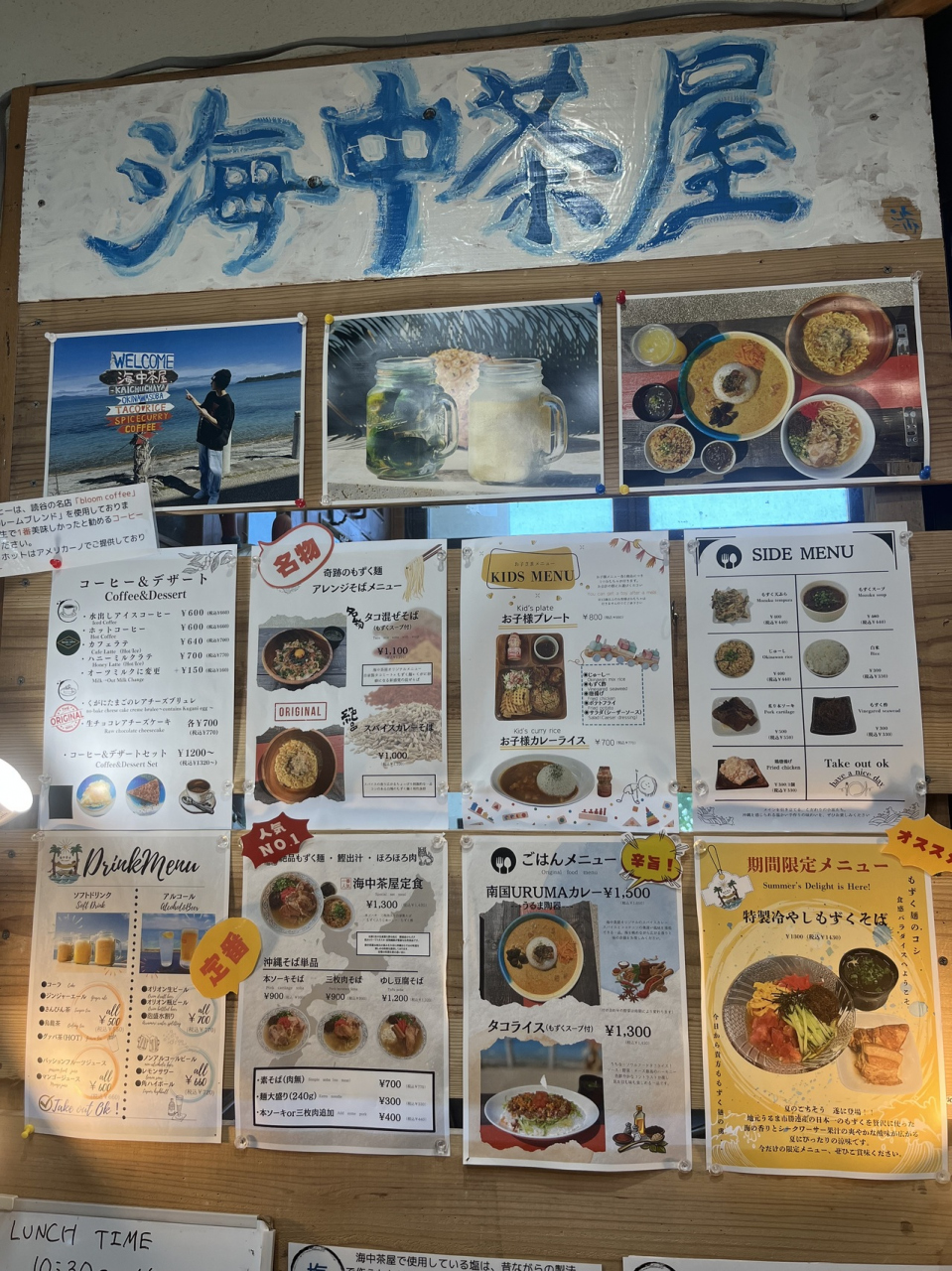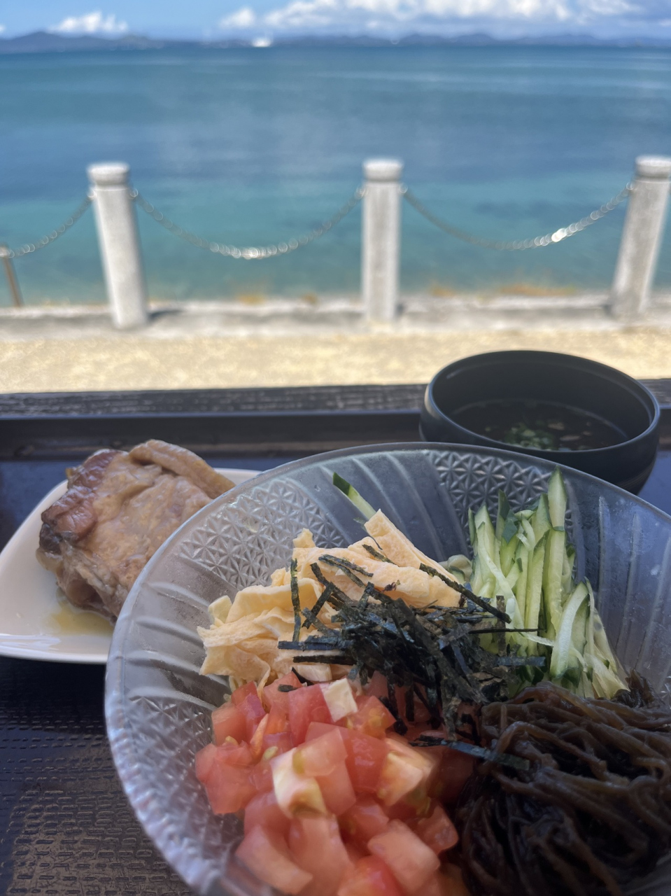 うるま市の海中道路沿いにある海の道あやはし館の中にあるレストランです。店内とテラス席があり、目の前には綺麗な海。海を眺めながらの食事は気持ち良いです。沖縄料理が豊富にあり、名物のもずくを練り込んだ冷やしもずくそばが期間限定だったので注文しました。セットになっていたソーキは柔らかくてジューシーでおすすめです!