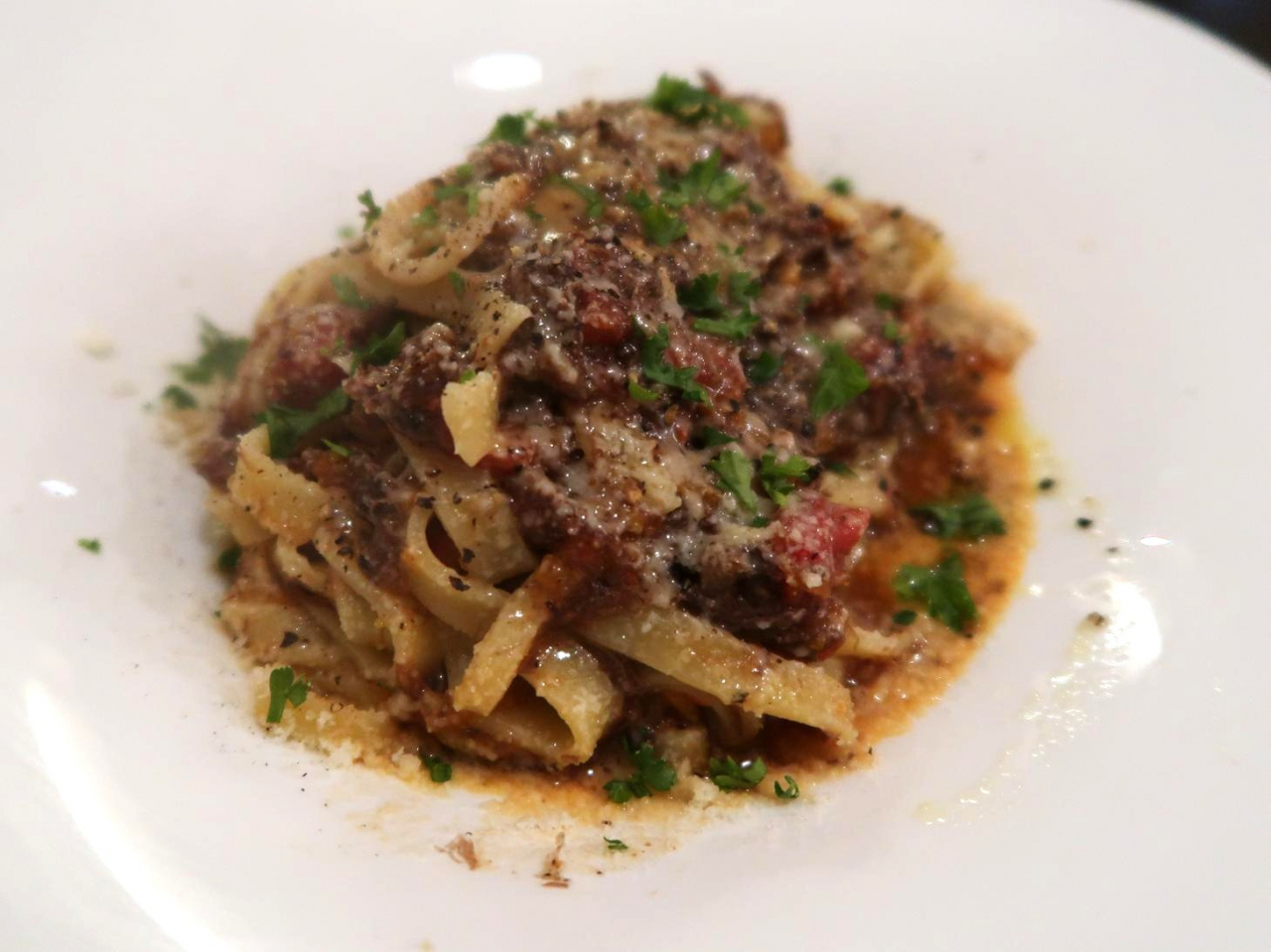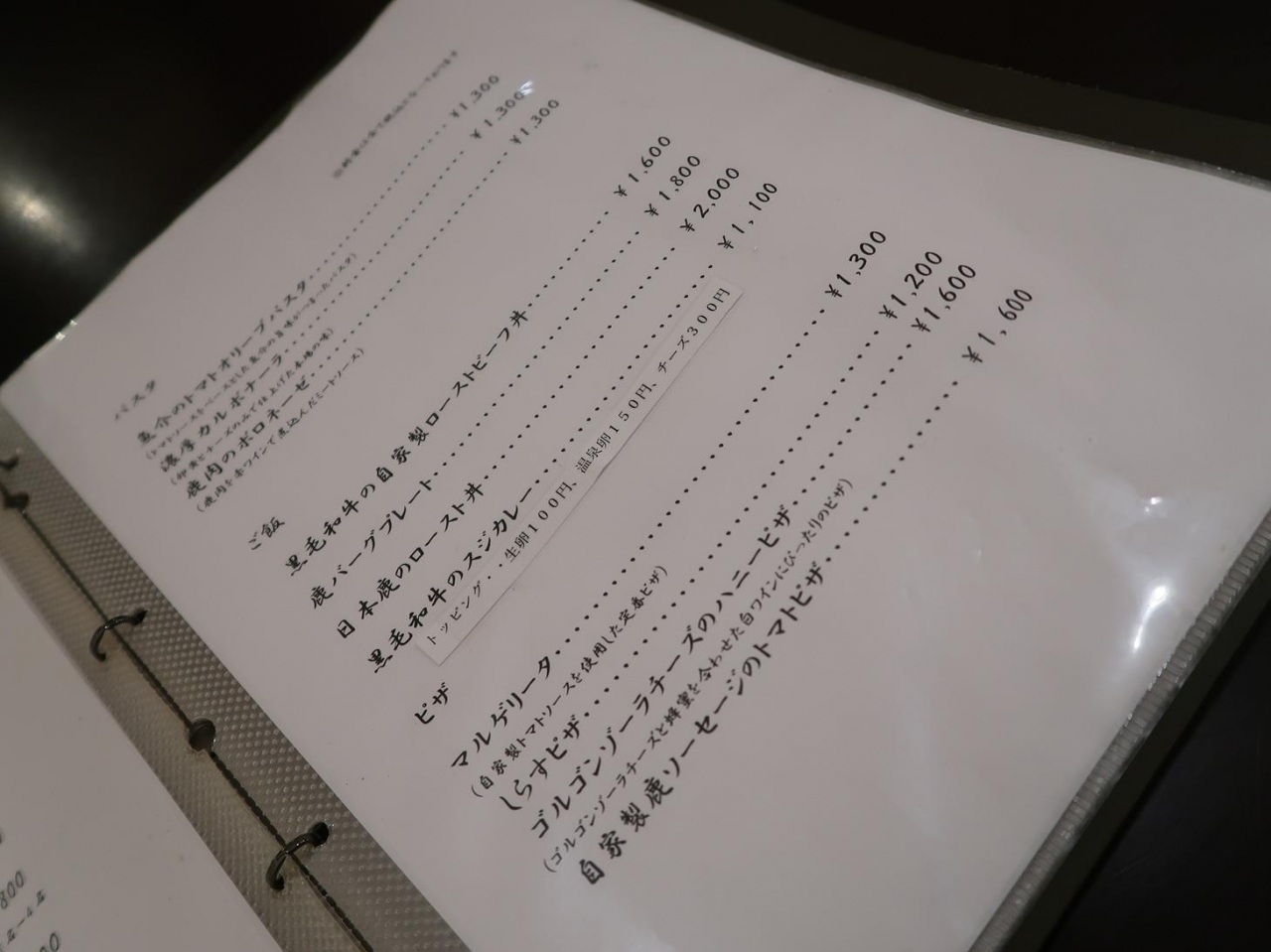 ジビエ料理メニューを見てみたところ、以前と同じように鹿肉ボロネーゼ・パスタ、イノシシの脂を練り込んだ鹿肉100%ハンバーグがあり、私たちはこの二種を頼んでシェアしながらいただいてみました。