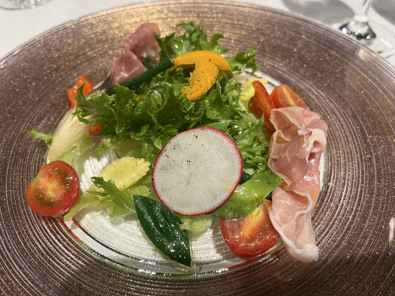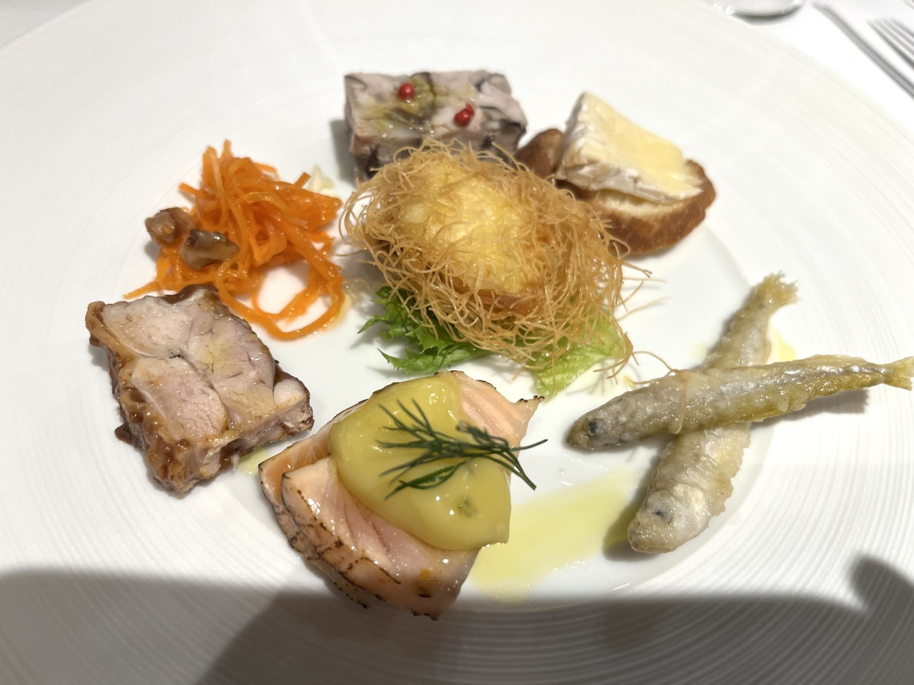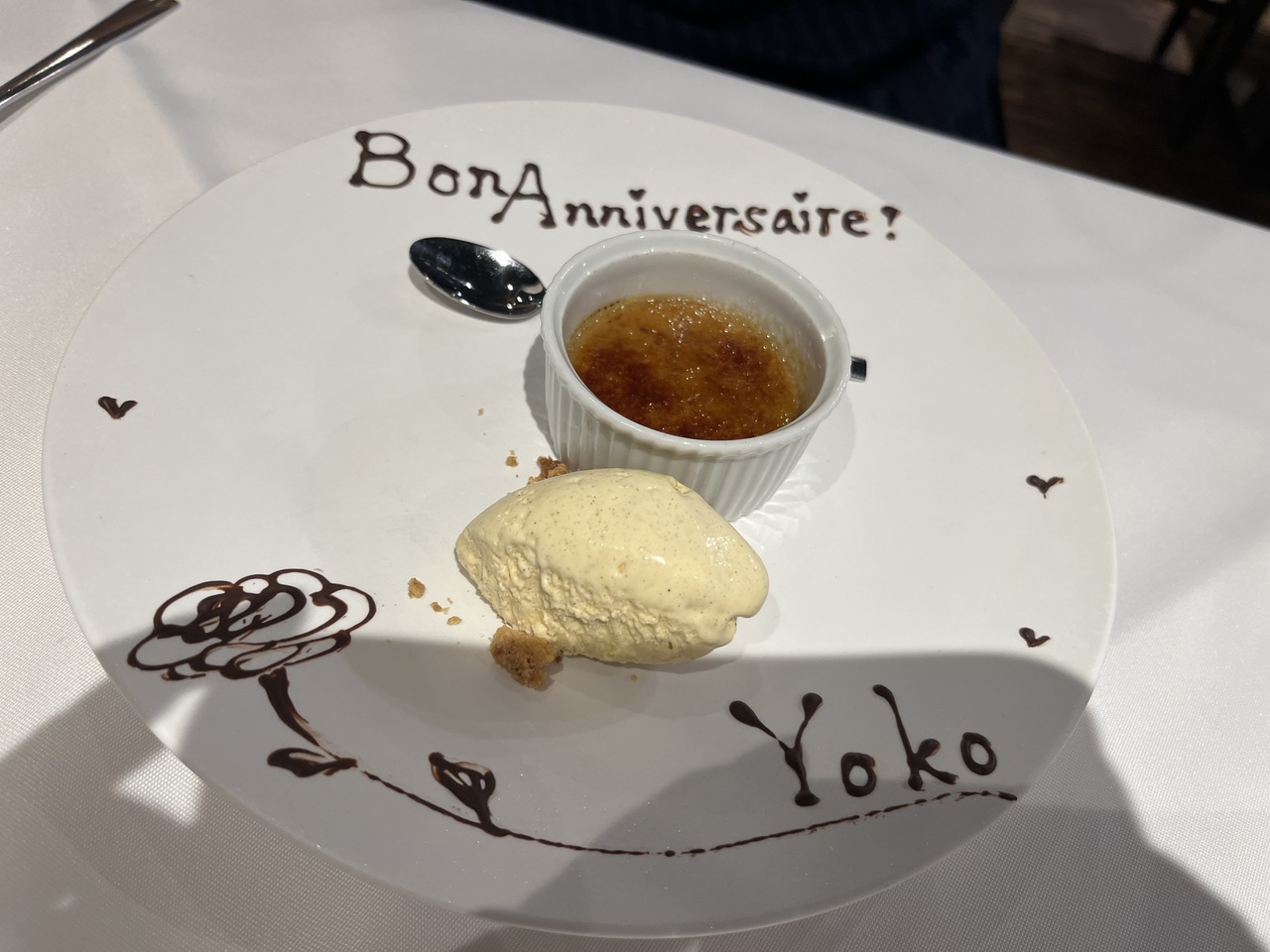 でも何と言っても素晴らしいのは、お料理。「前菜、サラダ、スープ、メイン、デザート、ワンドリンク」で7,300円のコースでしたが、まず前菜盛り合わせが: ワカサギのエスカベッシュ、サーモンのミキュイ、キャロットラペ、鶏の赤ワイン煮、スズキのカダイフ揚げ、カマンベール乗せバゲット、キノコのテリーヌと、どれも絶品でお酒が進む!つづいて生ハムと地元産の新鮮野菜のサラダ。野菜の味が濃くて満足感が高い。スープはさつまいものポタージュで、小さなカップで出てきて、一瞬「少ない?」と思うけど、濃厚で、さつまいもの甘さとスープ(コンソメ?)の味わいが満足感高くて、幸せな気持ちに。メインは肉か魚のそれぞれいくつかの選択肢から選べて、2人なので肉と魚を頼んで、分けてサーブしてくれるのでフルコースみたいに肉魚両方楽しめました。年なのでフルコースのガッツリ肉と魚は食べきれないから、ありがたい気遣いでした。イトヨリのポワレと、和牛のステーキ(追加料金)を頼んで、どちらも美味しかったけど、和牛のステーキは感動ものの美味しさでした!デザートプレートには友人の名前と「Bon Anniversaire(お誕生日おめでとう)」のメッセージを入れてくださり、友人感激。ワインも美味しくて、大満足のディナーでした。