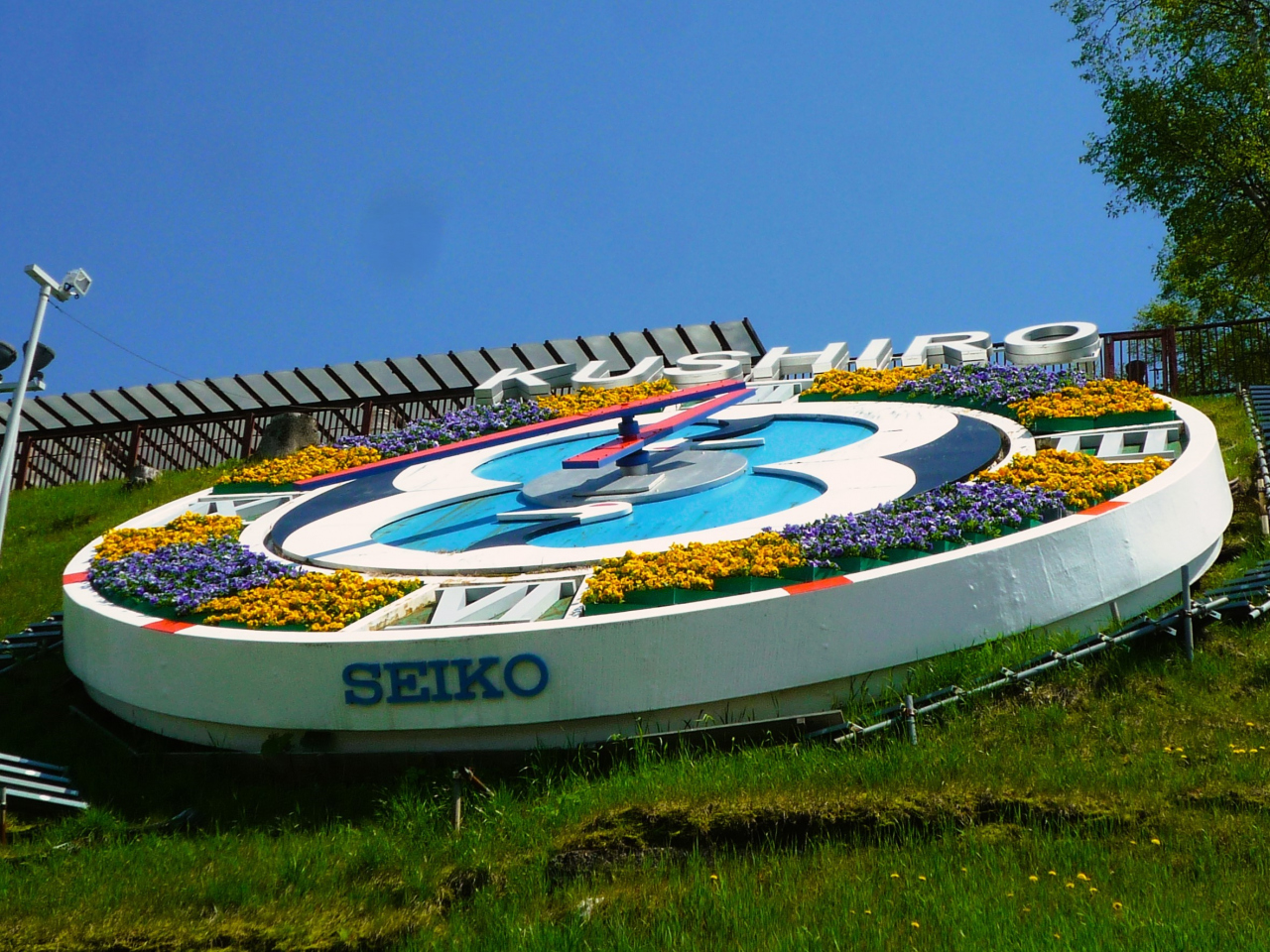 昭和55年に緑いっぱい市民運動の10周年を記念して、直径10mで長針4m・短針3mで長針と短針を合わせた重量は200kgもありセイコー製だそうです。そして、植え込みは年4回季節ごとの花を入れ替えて四季折々の花が彩られます。